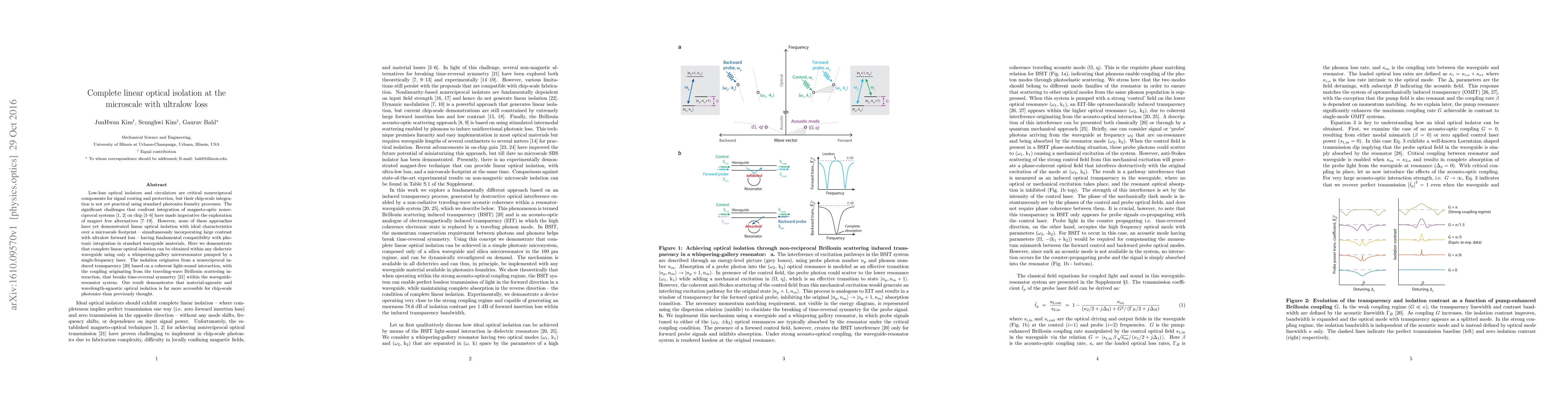 Low-loss optical isolators and circulators are critical nonreciprocal components for signal routing and protection, but their chip-scale integration is not yet practical using standard photonics foundry processes. The significant challenges that confront integration of magneto-optic nonreciprocal systems on chip have made imperative the exploration of magnet free alternatives. However, none of these approaches have yet demonstrated linear optical isolation with ideal characteristics over a microscale footprint - simultaneously incorporating large contrast with ultralow forward loss - having fundamental compatibility with photonic integration in standard waveguide materials. Here we demonstrate that complete linear optical isolation can be obtained within any dielectric waveguide using only a whispering-gallery microresonator pumped by a single-frequency laser. The isolation originates from a nonreciprocal induced transparency based on a coherent light-sound interaction, with the coupling originating from the traveling-wave Brillouin scattering interaction, that breaks time-reversal symmetry within the waveguide-resonator system. Our result demonstrates that material-agnostic and wavelength-agnostic optical isolation is far more accessible for chip-scale photonics than previously thought.
