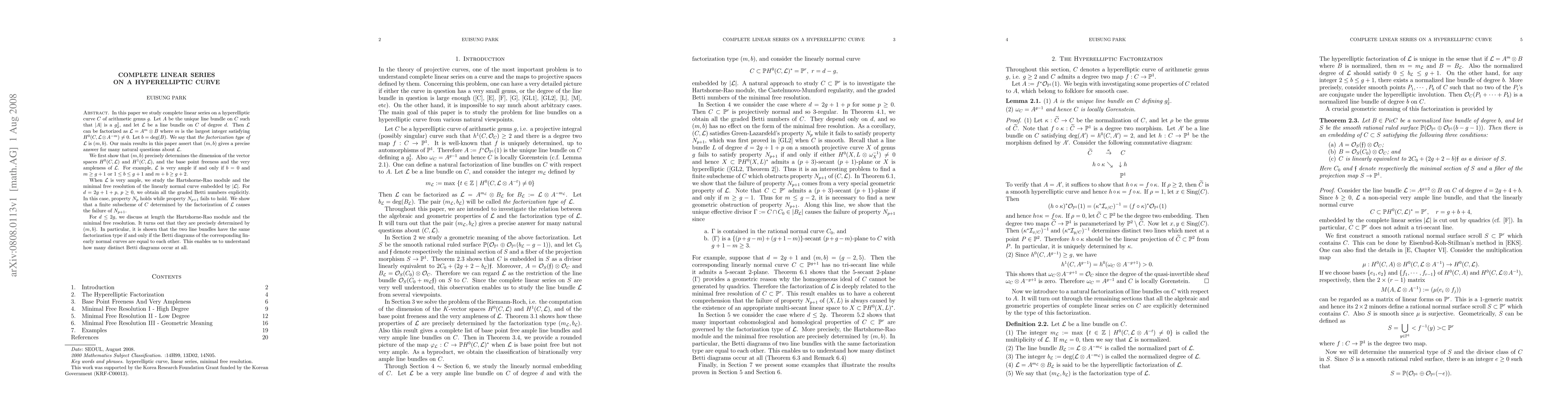 In this paper we study complete linear series on a hyperelliptic curve $C$ of arithmetic genus $g$. Let $A$ be the unique line bundle on $C$ such that $|A|$ is a $g^1_2$, and let $\mathcal{L}$ be a line bundle on $C$ of degree $d$. Then $\mathcal{L}$ can be factorized as $\mathcal{L} = A^m \otimes B$ where $m$ is the largest integer satisfying $H^0 (C,\mathcal{L} \otimes A^{-m}) \neq 0$. Let $b = {deg}(B)$. We say that \textit{the factorization type of} $\mathcal{L}$ is $(m,b)$. Our main results in this paper assert that $(m,b)$ gives a precise answer for many natural questions about $\mathcal{L}$.