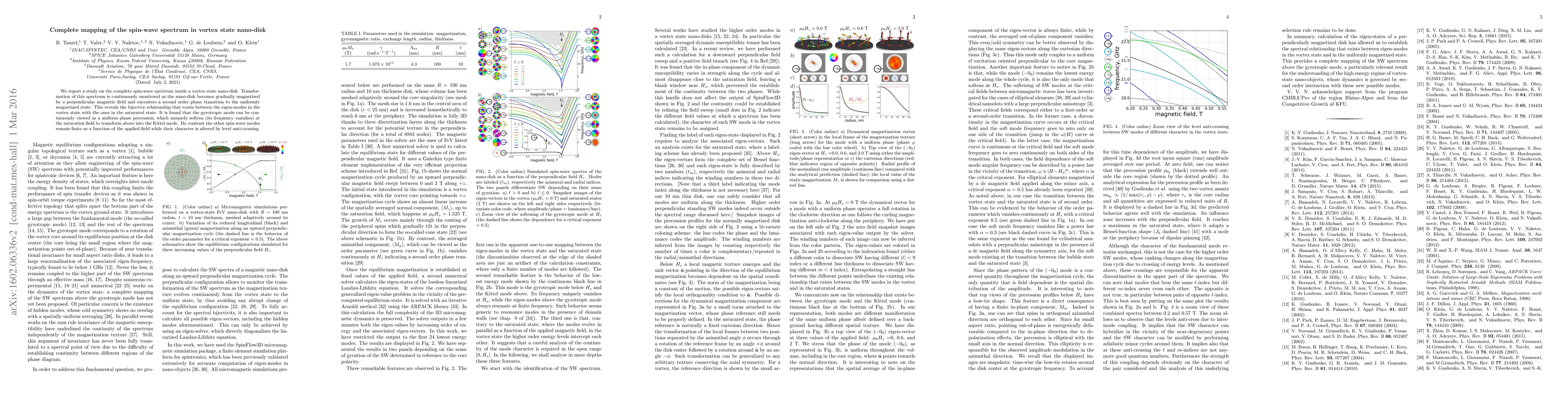 We report a study on the complete spin-wave spectrum inside a vortex state nano-disk. Transformation of this spectrum is continuously monitored as the nano-disk becomes gradually magnetized by a perpendicular magnetic field and encouters a second order phase transition to the uniformly magnetized state. This reveals the bijective relationship that exists between the eigen-modes in the vortex state with the ones in the saturated state. It is found that the gyrotropic mode can be continuously viewed as a uniform phase precession, which uniquely softens (its frequency vanishes) at the saturation field to transform above into the Kittel mode. By contrast the other spin-wave modes remain finite as a function of the applied field while their character is altered by level anti-crossing.