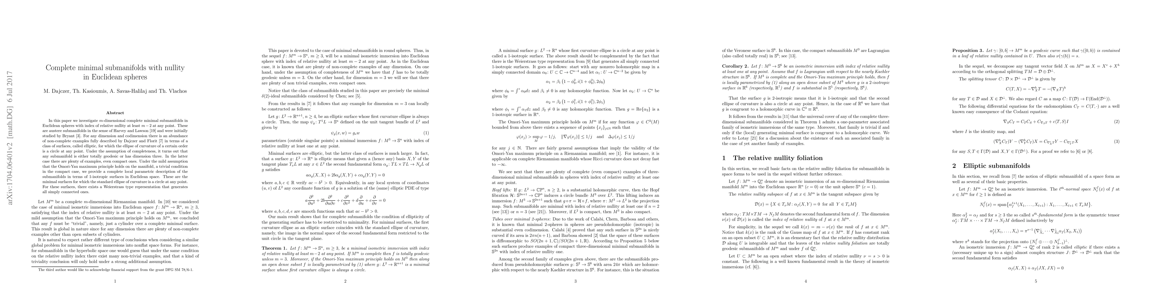 This paper explores complete minimal submanifolds in Euclidean spheres with high relative nullity, showing that such submanifolds are either totally geodesic or three-dimensional. It provides a local parametric description of these three-dimensional cases using 1-isotropic surfaces and Weierstrass representations.
