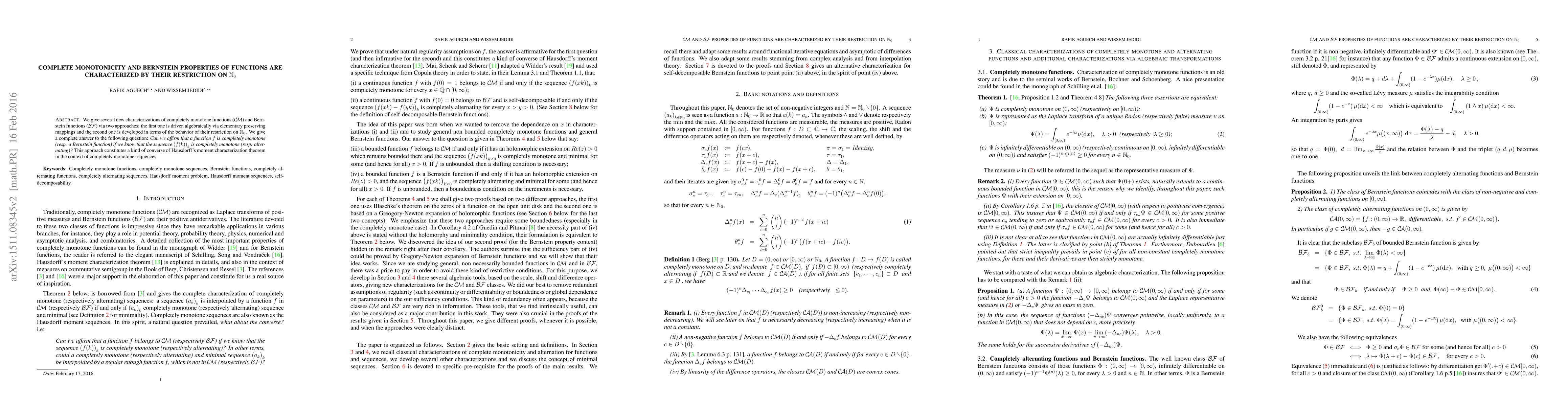 Research characterizes completely monotone functions and Bernstein functions based on their restriction to non-negative integers, providing a converse of Hausdorff's moment characterization theorem.
