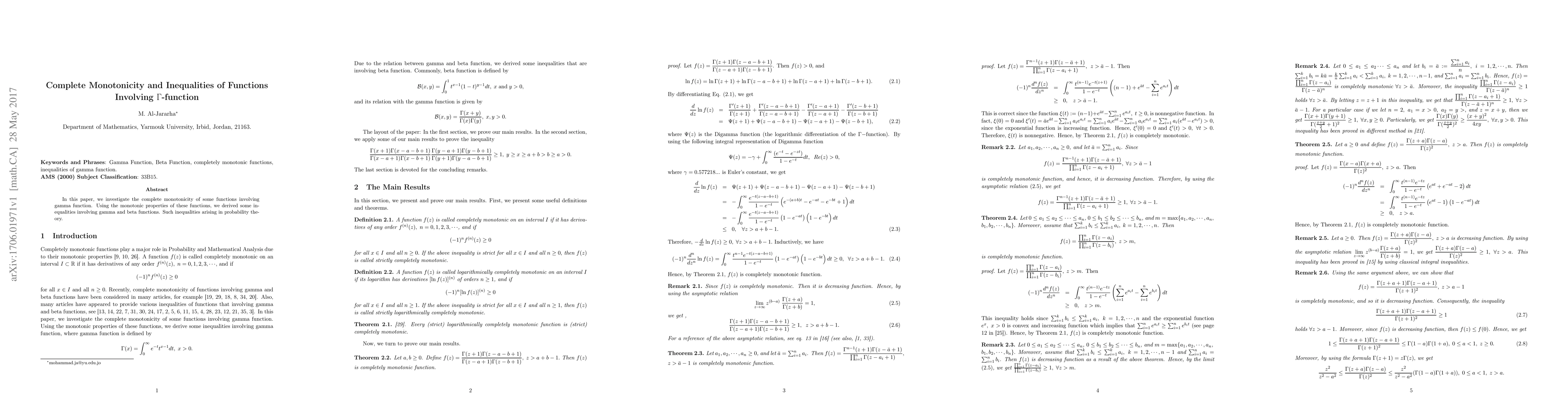 Summary: This paper explores the complete monotonicity of functions involving the gamma function and utilizes these properties to derive inequalities for gamma and beta functions, which have applications in probability theory.