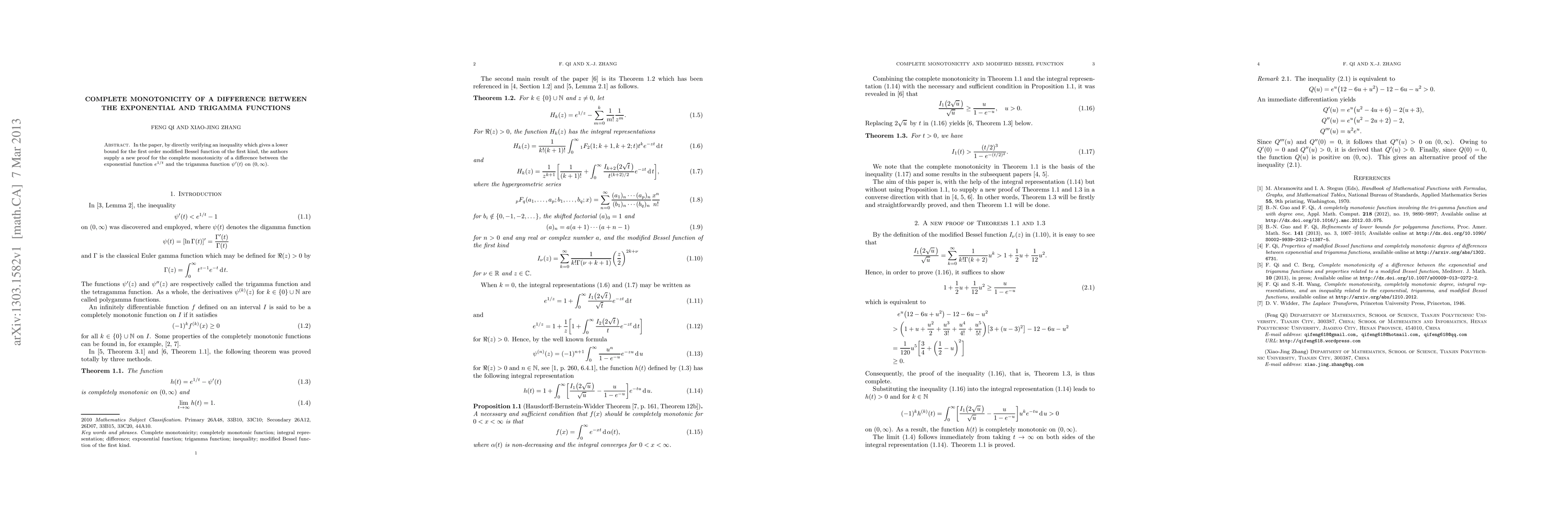 The paper provides a new proof for the complete monotonicity of the difference between the exponential function $e^{1/t}$ and the trigamma function $\psi'(t)$ on $(0,\infty)$ by verifying an inequality related to the first order modified Bessel function. This establishes a lower bound for the function's monotonic behavior.