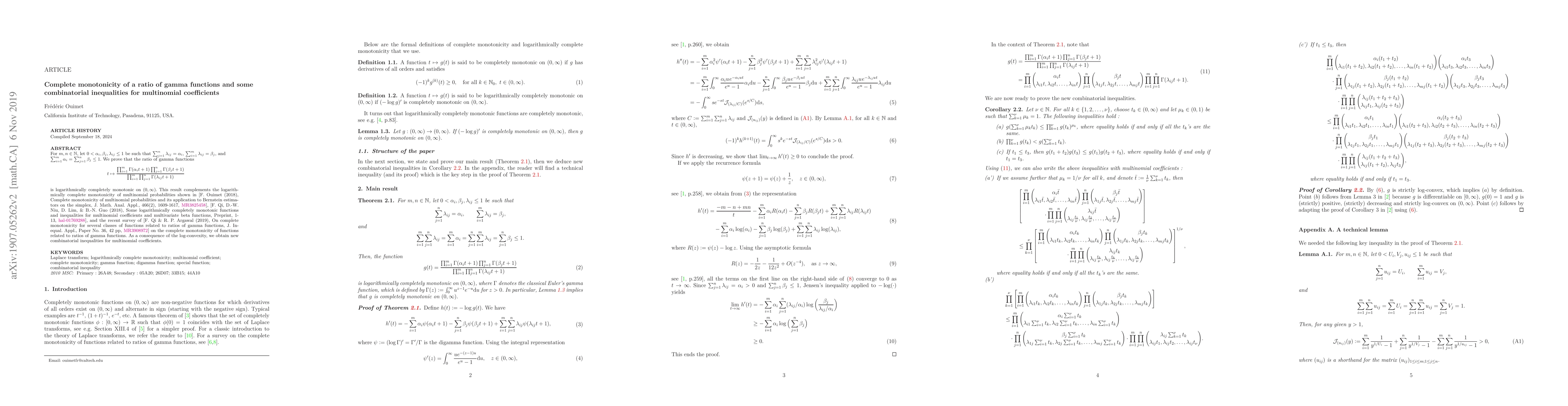 A new theorem proves a ratio of gamma functions is log-convex on (0,∞), leading to combinatorial inequalities for multinomial coefficients. The result complements previous work on complete monotonicity of related functions.