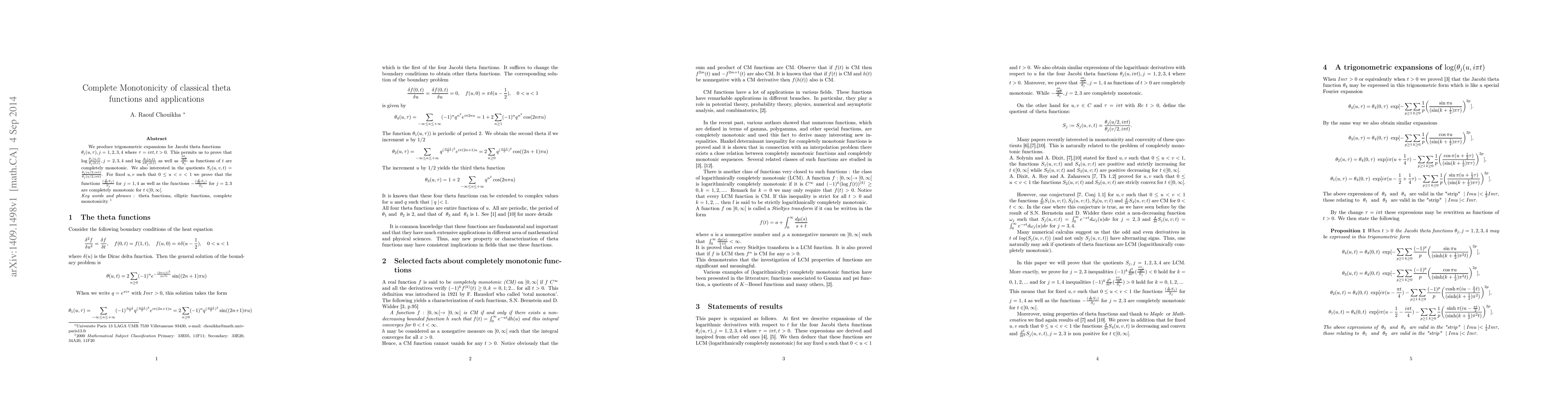 We produce trigonometric expansions for Jacobi theta functions\\ $\theta_j(u,\tau), j=1,2,3,4$\ where $\tau=i\pi t, t > 0$. This permits us to prove that\ $\log \frac{\theta_j(u, t)}{\theta_j(0, t)}, j=2,3,4$ and $\log \frac{\theta_1(u, t)}{\pi \theta'_1(0, t)}$ as well as $\frac{\frac{\delta\theta_j}{\delta u}}{\theta_j}$ as functions of $t$ are completely monotonic. We also interested in the quotients $S_j(u,v,t) = \frac{\theta_j(u/2,i\pi t)}{\theta_j(u/2,i\pi t)}$. For fixed $u,v$ such that $0\leq u < v < 1$ we prove that the functions $\frac{(\frac{\delta}{\delta t}S_j)}{S_j}$ for $j=1,4$ as well as the functions $-\frac{(\frac{\delta}{\delta t}S_j)}{S_j}$ for $j=2,3$ are completely monotonic for $t \in ]0,\infty[$.\\ {\it Key words and phrases} : theta functions, elliptic functions, complete monotonicity.