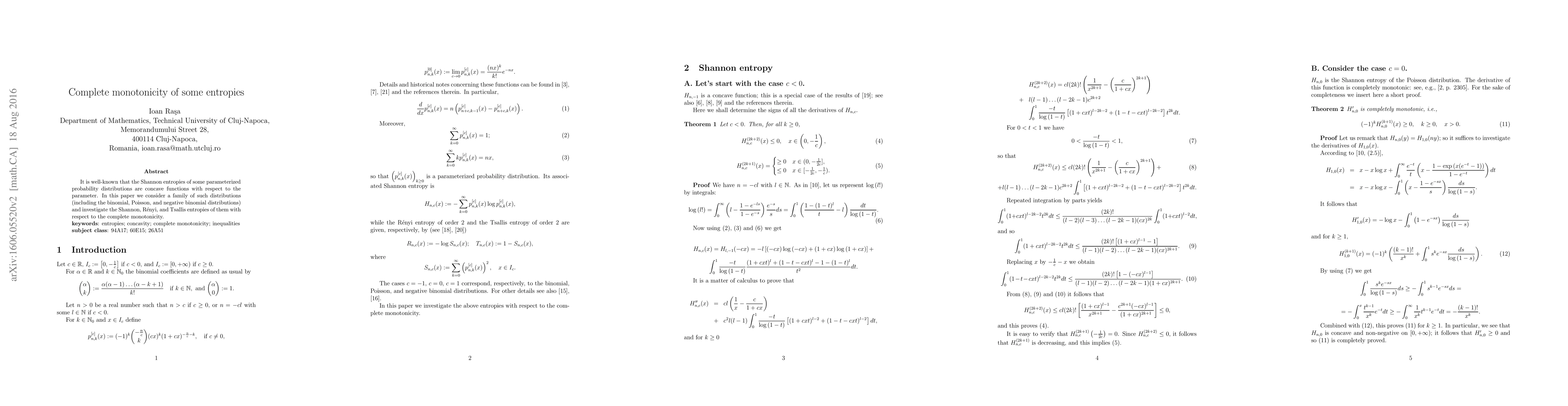 It is well-known that the Shannon entropies of some parameterized probability distributions are concave functions with respect to the parameter. In this paper we consider a family of such distributions (including the binomial, Poisson, and negative binomial distributions) and investigate the Shannon, R\'{e}nyi, and Tsallis entropies of them with respect to the complete monotonicity.