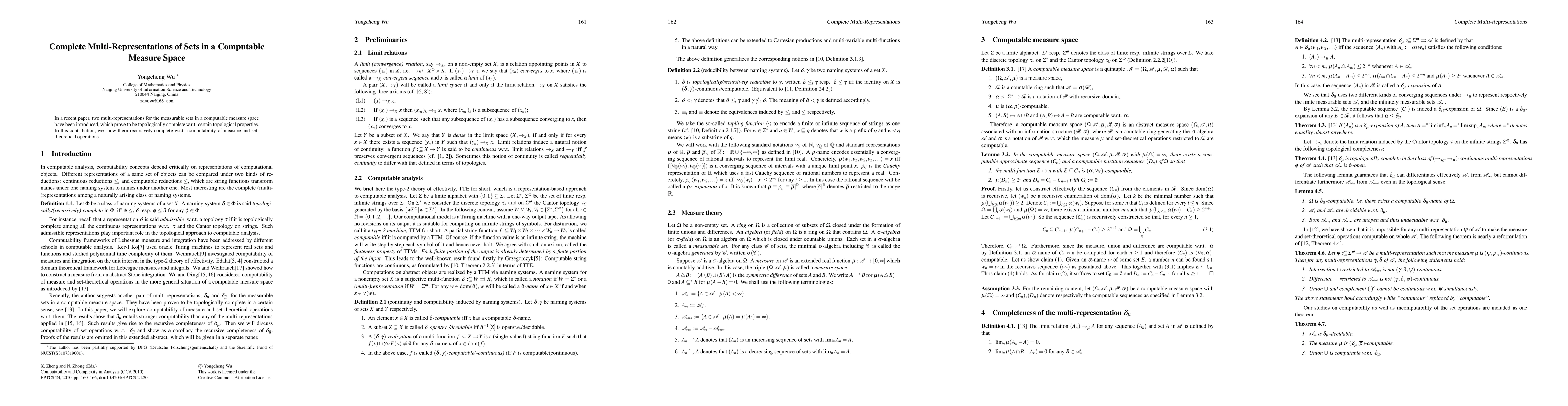 This paper demonstrates the recursive completeness of two multi-representations for measurable sets in a computable measure space, showing they are effective for computability of measure and set-theoretical operations. The representations are shown to be topologically complete as well.