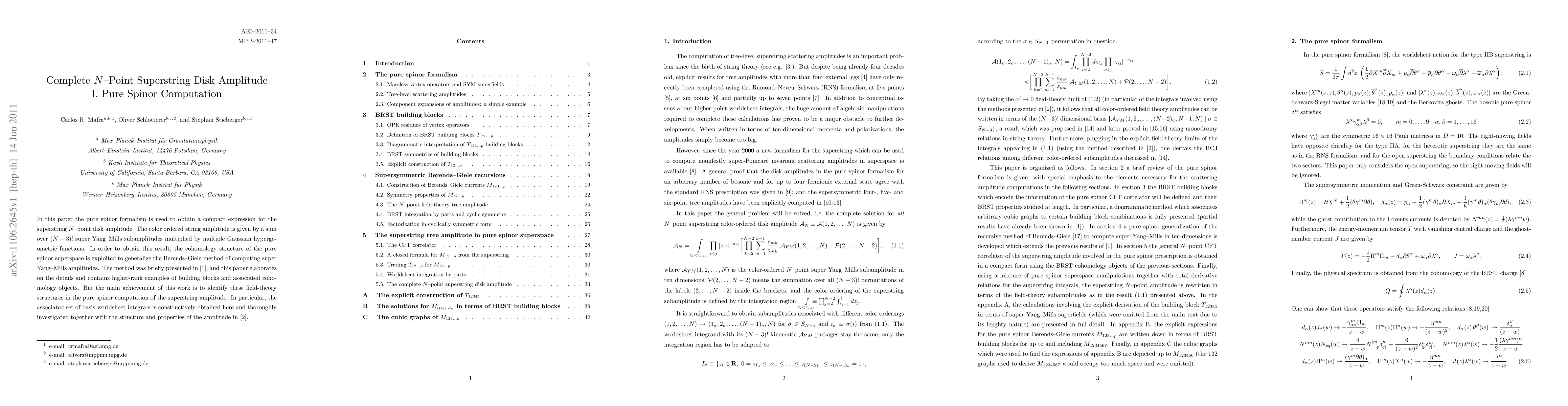 In this paper the pure spinor formalism is used to obtain a compact expression for the superstring N-point disk amplitude. The color ordered string amplitude is given by a sum over (N-3)! super Yang-Mills subamplitudes multiplied by multiple Gaussian hypergeometric functions. In order to obtain this result, the cohomology structure of the pure spinor superspace is exploited to generalize the Berends-Giele method of computing super Yang-Mills amplitudes. The method was briefly presented in [1], and this paper elaborates on the details and contains higher-rank examples of building blocks and associated cohomology objects. But the main achievement of this work is to identify these field-theory structures in the pure spinor computation of the superstring amplitude. In particular, the associated set of basis worldsheet integrals is constructively obtained here and thoroughly investigated together with the structure and properties of the amplitude in [2].