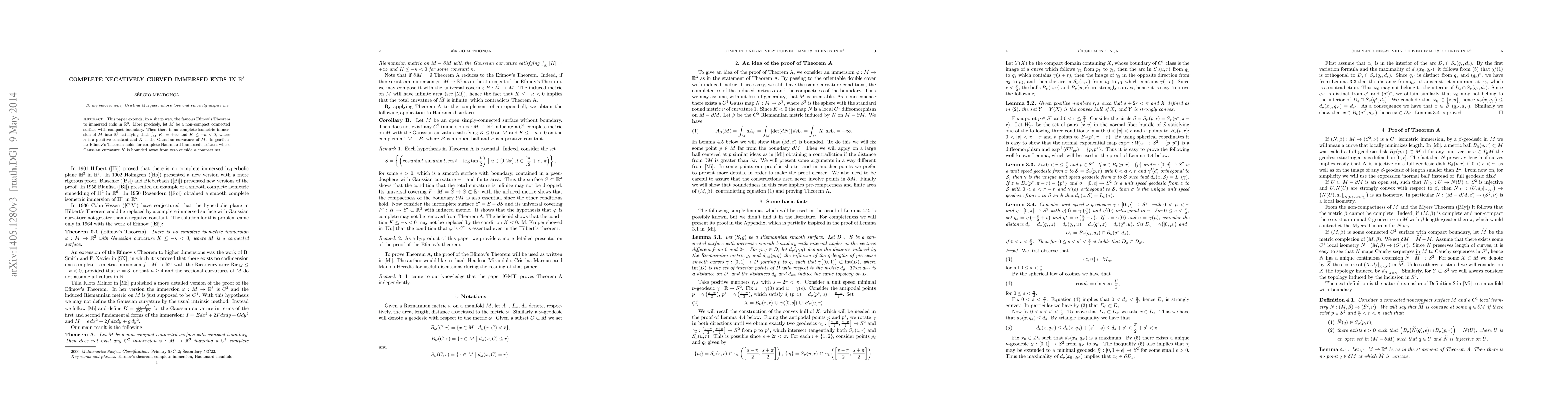 The paper introduces and proves a new theorem concerning the immersion of negatively curved surfaces into $\Bbb R^3$, extending Efimov's Theorem to immersed ends.