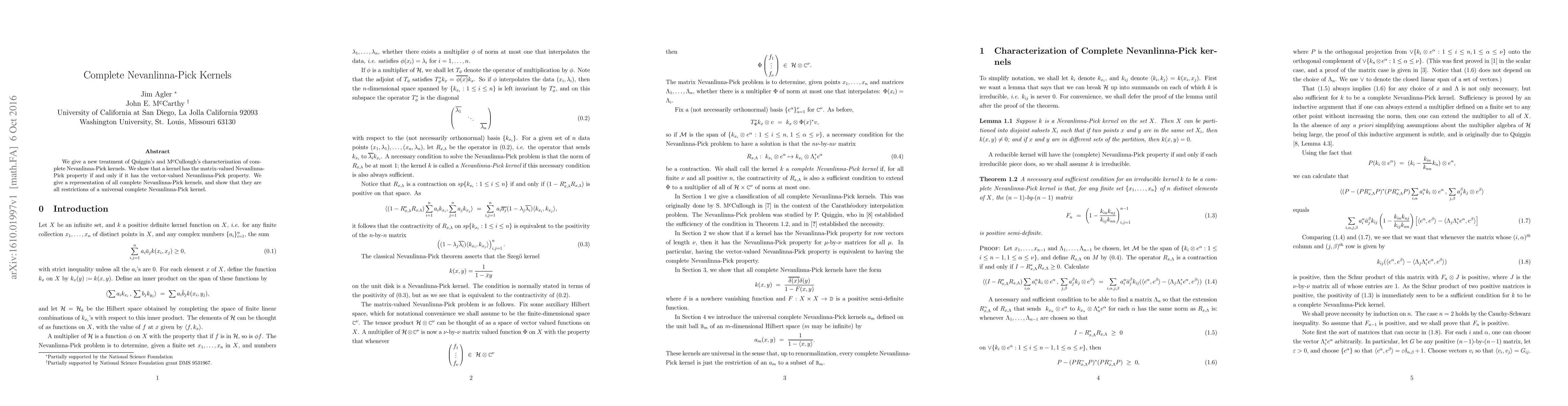 This paper provides a new characterization of complete Nevanlinna-Pick kernels, demonstrating equivalence between matrix-valued and vector-valued properties. It also presents a universal representation of all such kernels, showing they are restrictions of a single universal kernel.