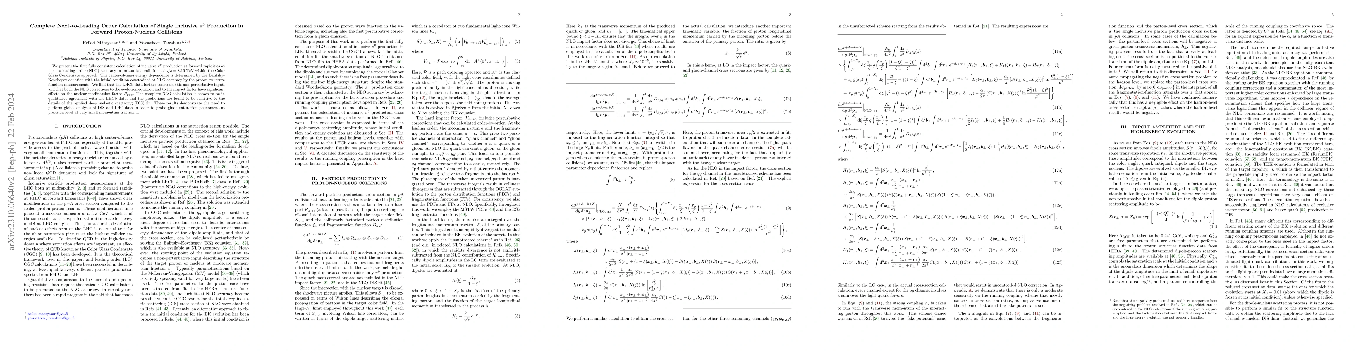 This paper presents the first complete next-to-leading order (NLO) calculation for inclusive $\pi^0$ production in proton-lead collisions at forward rapidities, using the Color Glass Condensate framework. The results show significant NLO effects on the nuclear modification factor $R_{p\mathrm{Pb}}$ and are in qualitative agreement with LHCb data, highlighting the need for global analyses of DIS and LHC data to study gluon saturation at small $x$.