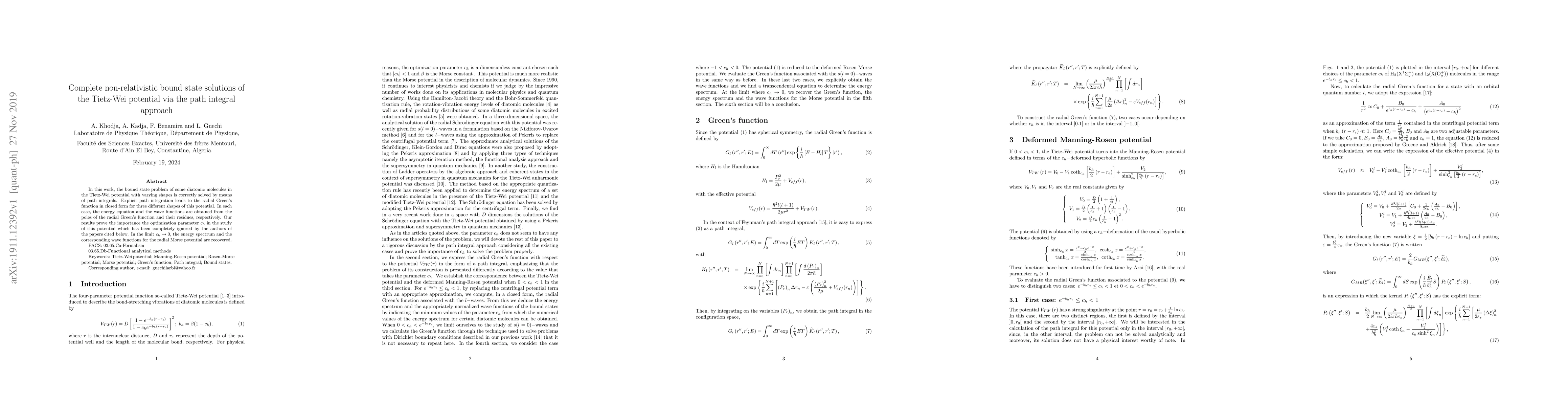 This paper solves the bound state problem for diatomic molecules in the Tietz-Wei potential using path integral methods, deriving closed-form radial Green's functions for three potential shapes. The study highlights the significance of the optimization parameter $c_{h}$ and recovers the radial Morse potential as $c_{h}$ approaches zero.
