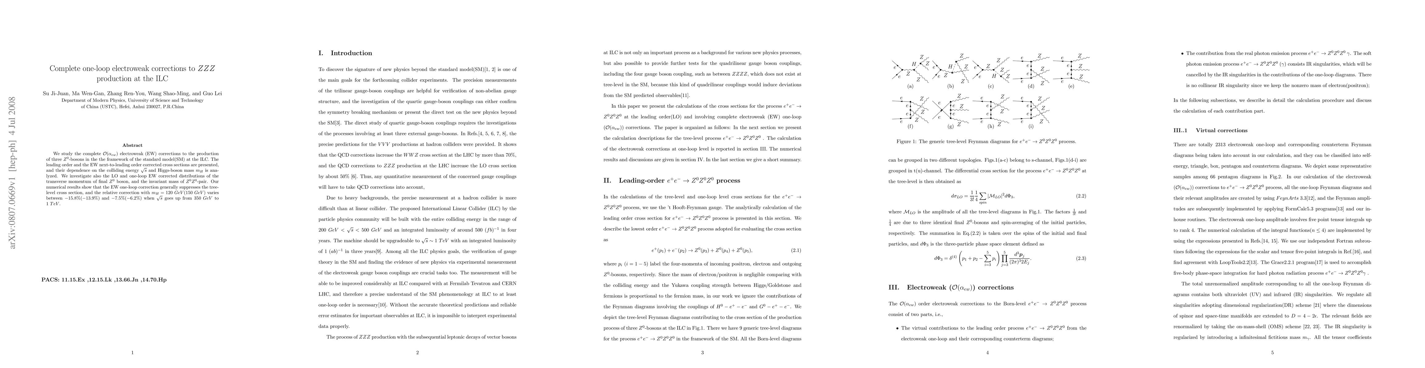 We study the complete ${\cal O}(\alpha_{ew})$ electroweak (EW) corrections to the production of three $Z^0$-bosons in the the framework of the standard model(SM) at the ILC. The leading order and the EW next-to-leading order corrected cross sections are presented, and their dependence on the colliding energy $\sqrt{s}$ and Higgs-boson mass $m_{H}$ is analyzed. We investigate also the LO and one-loop EW corrected distributions of the transverse momentum of final $Z^0$ boson, and the invariant mass of $Z^0Z^0$-pair. Our numerical results show that the EW one-loop correction generally suppresses the tree-level cross section, and the relative correction with $m_{H}=120 GeV(150 GeV)$ varies between $-15.8%(-13.9%)$ and $-7.5%(-6.2%)$ when $\sqrt{s}$ goes up from $350 GeV$ to $1 TeV$.