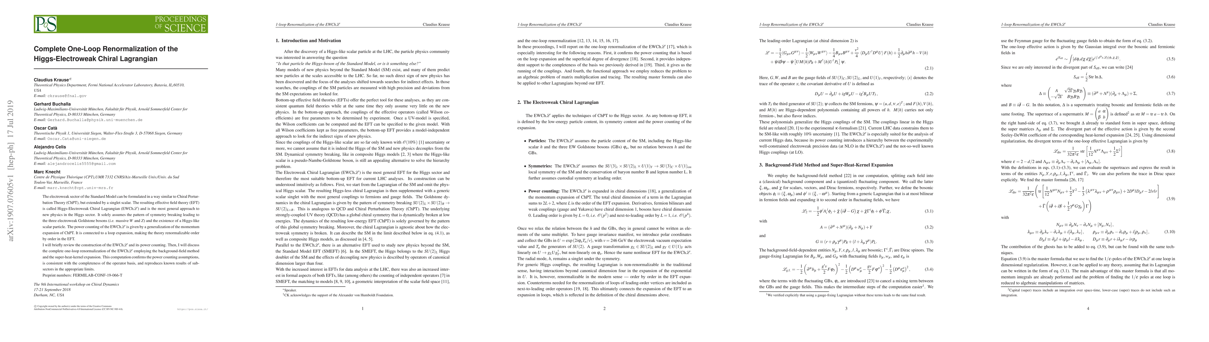 The electroweak sector of the Standard Model can be formulated in a way similar to Chiral Perturbation Theory (ChPT), but extended by a singlet scalar. The resulting effective field theory (EFT) is called Higgs-Electroweak Chiral Lagrangian (EWCh$\mathcal{L}$) and is the most general approach to new physics in the Higgs sector. It solely assumes the pattern of symmetry breaking leading to the three electroweak Goldstone bosons (i.e. massive $W$ and $Z$) and the existence of a Higgs-like scalar particle. The power counting of the EWCh$\mathcal{L}$ is given by a generalization of the momentum expansion of ChPT. It is connected to a loop expansion, making the theory renormalizable order by order in the EFT. I will briefly review the construction of the EWCh$\mathcal{L}$ and its power counting. Then, I will discuss the complete one-loop renormalization of the EWCh$\mathcal{L}$ employing the background-field method and the super-heat-kernel expansion. This computation confirms the power counting assumptions, is consistent with the completeness of the operator basis, and reproduces known results of subsectors in the appropriate limits.