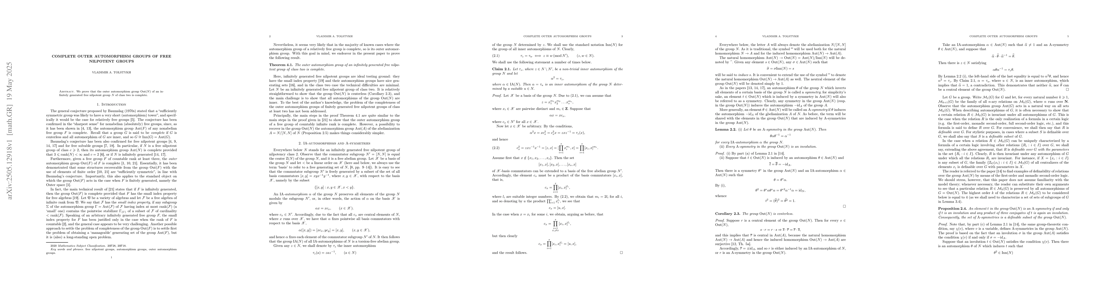 The research employs group-theoretic techniques, specifically focusing on free nilpotent groups of class two to prove completeness of their outer automorphism groups.