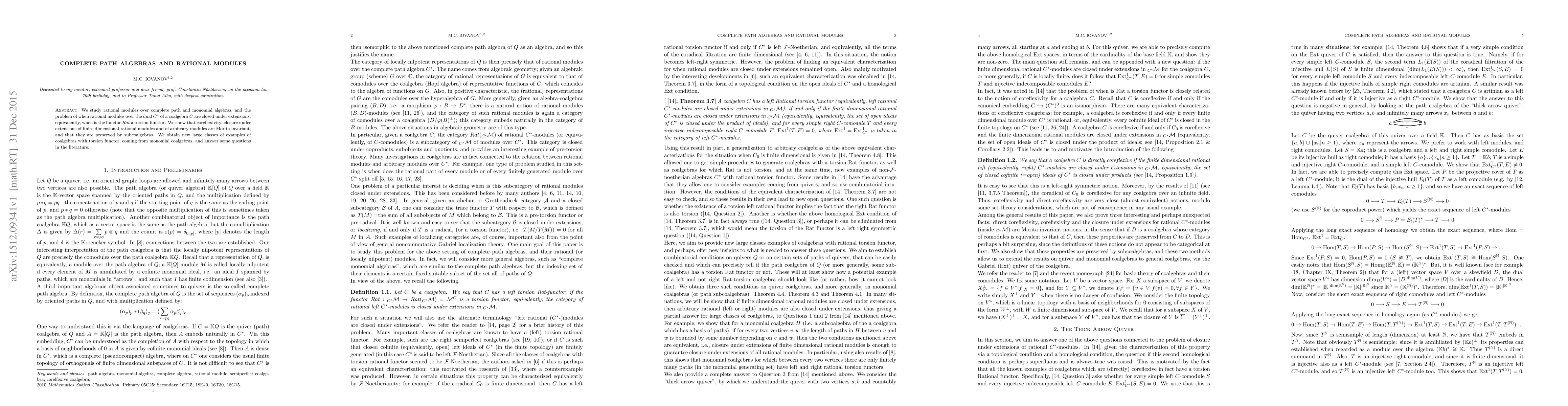 We study rational modules over complete path and monomial algebras, and the problem of when rational modules over the dual $C^*$ of a coalgebra $C$ are closed under extensions, equivalently, when is the functor $Rat$ a torsion functor. We show that coreflexivity, closure under extensions of finite dimensional rational modules and of arbitrary modules are Morita invariant, and that they are preserved by subcoalgebras. We obtain new large classes of examples of coalgebras with torsion functor, coming from monomial coalgebras, and answer some questions in the literature.