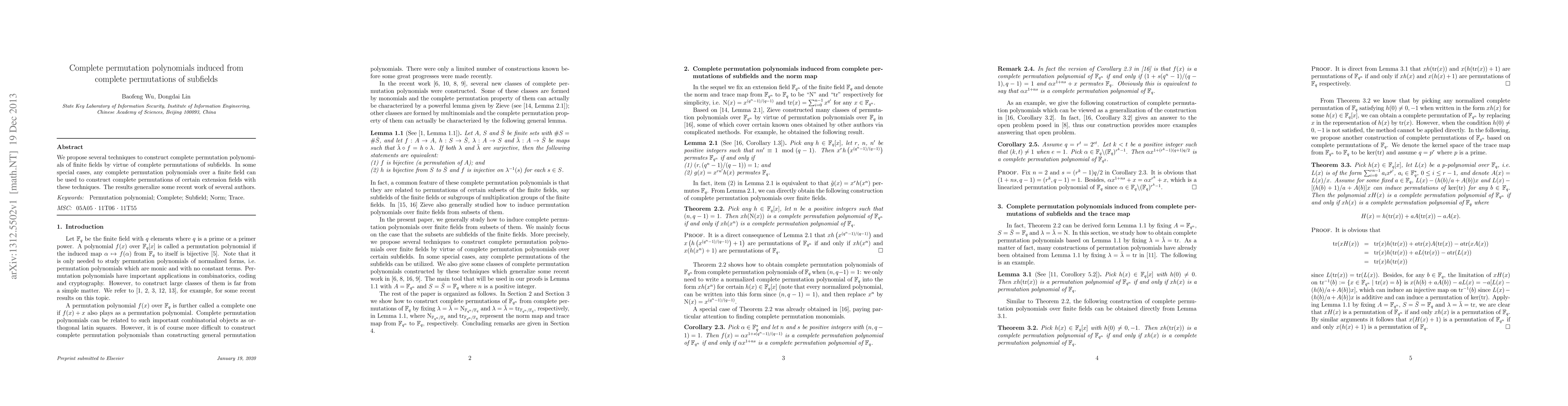 This paper presents methods to build complete permutation polynomials in finite fields using complete permutations of subfields, extending recent findings and demonstrating their applicability to construct permutations in certain extension fields. The techniques generalize previous work by multiple researchers.