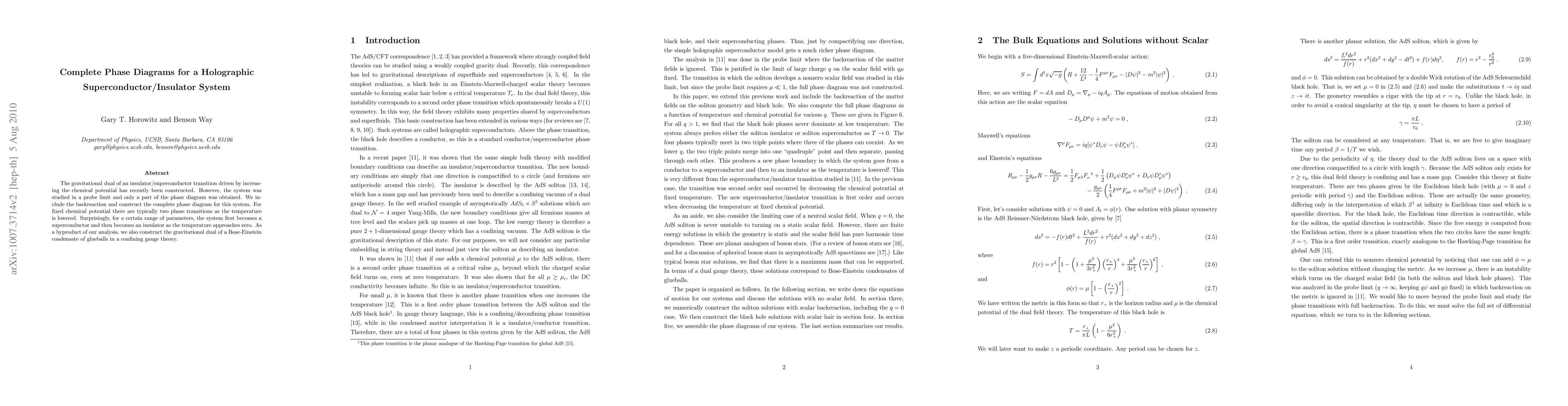 The gravitational dual of an insulator/superconductor transition driven by increasing the chemical potential has recently been constructed. However, the system was studied in a probe limit and only a part of the phase diagram was obtained. We include the backreaction and construct the complete phase diagram for this system. For fixed chemical potential there are typically two phase transitions as the temperature is lowered. Surprisingly, for a certain range of parameters, the system first becomes a superconductor and then becomes an insulator as the temperature approaches zero. As a byproduct of our analysis, we also construct the gravitational dual of a Bose-Einstein condensate of glueballs in a confining gauge theory.