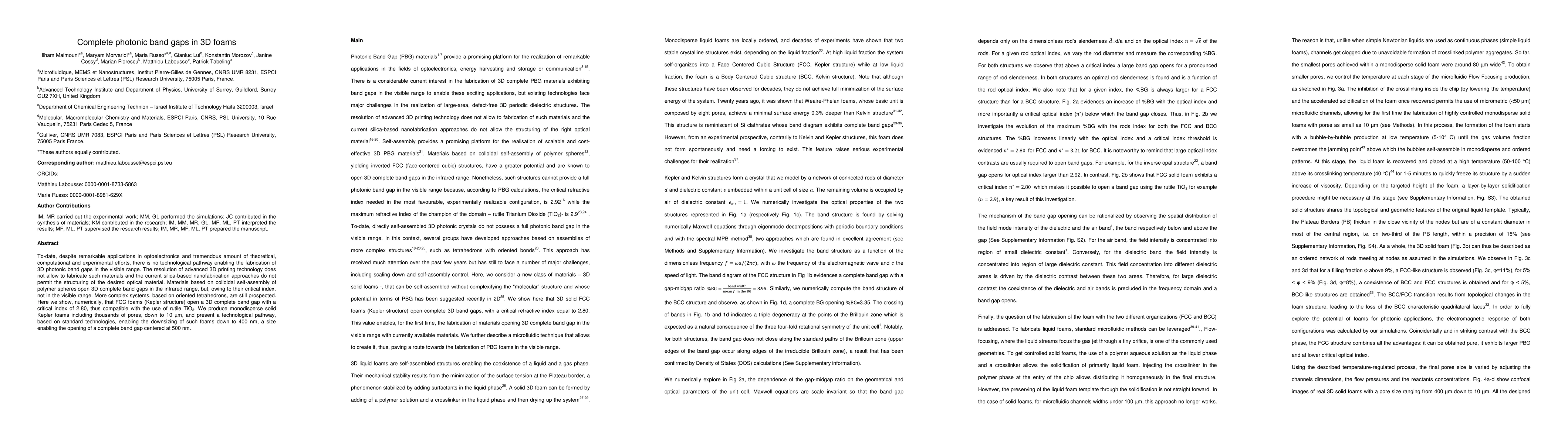 This paper demonstrates the numerical prediction and experimental realization of 3D photonic band gaps in FCC foams (Kepler structure) using rutile TiO2, enabling a complete band gap in the visible range at 500 nm through advanced fabrication techniques. The study provides a technological pathway for producing these structures down to 400 nm, overcoming previous limitations in material fabrication.