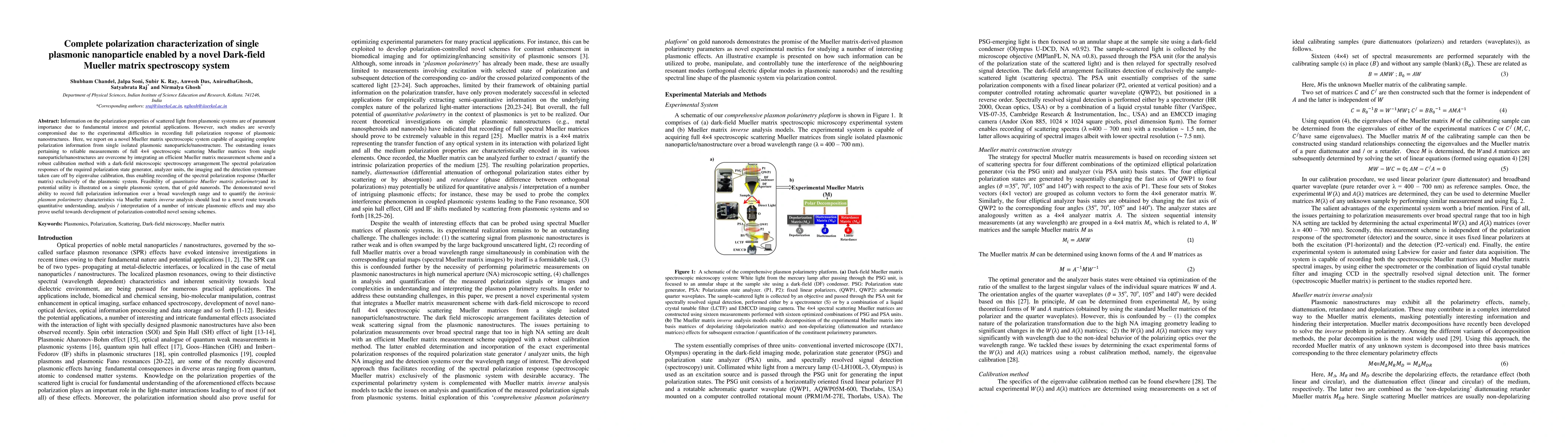 Information on the polarization properties of scattered light from plasmonic systems are of paramount importance due to fundamental interest and potential applications. However, such studies are severely compromised due to the experimental difficulties in recording full polarization response of plasmonic nanostructures. Here, we report on a novel Mueller matrix spectroscopic system capable of acquiring complete polarization information from single isolated plasmonic nanoparticle/nanostructure. The outstanding issues pertaining to reliable measurements of full 4X4 spectroscopic scattering Mueller matrices from single nanoparticle/nanostructures are overcome by integrating an efficient Mueller matrix measurement scheme and a robust calibration method with a dark-field microscopic spectroscopy arrangement.The spectral polarization responses of the required polarization state generator, analyzer units, the imaging and the detection systemsare taken care off by eigenvalue calibration, thus enabling recording of the spectral polarization response (Mueller matrix) exclusively of the plasmonic system. Feasibility of quantitative Mueller matrix polarimetryand its potential utility is illustrated on a simple plasmonic system, that of gold nanorods. The demonstrated novel ability to record full polarization information over a broad wavelength range and to quantify the intrinsic plasmon polarimetry characteristics via Mueller matrix inverse analysis should lead to a novel route towards quantitative understanding, analysis / interpretation of a number of intricate plasmonic effects and may also prove useful towards development of polarization-controlled novel sensing schemes.
