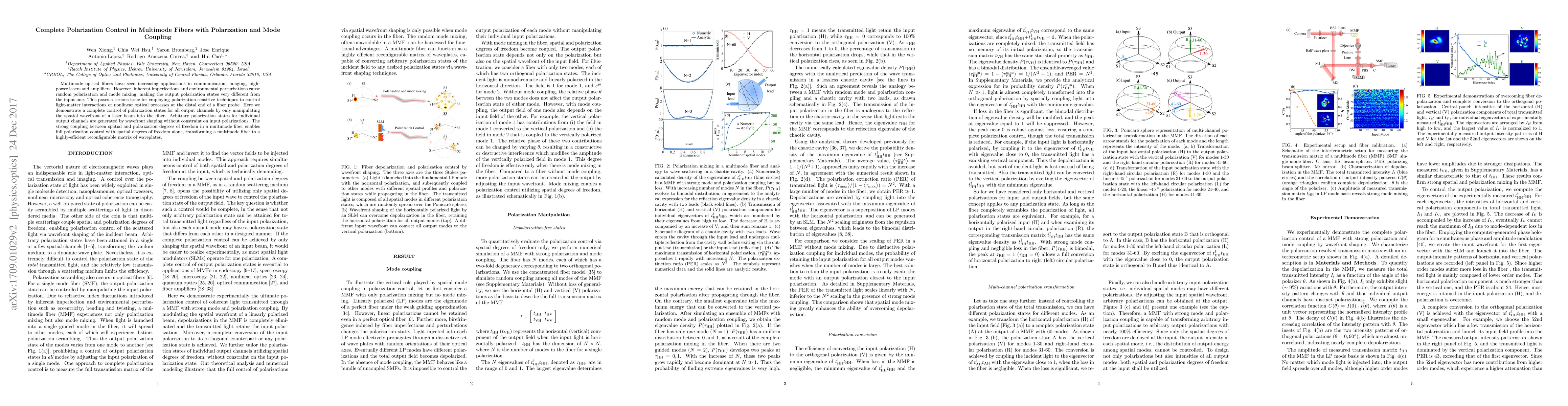 This paper demonstrates a method to achieve complete polarization control in multimode fibers by manipulating the spatial wavefront of a laser beam, enabling arbitrary polarization states for each output channel without constraints on input polarizations. This technique leverages the coupling between spatial and polarization degrees of freedom, transforming the fiber into a reconfigurable matrix of waveplates.