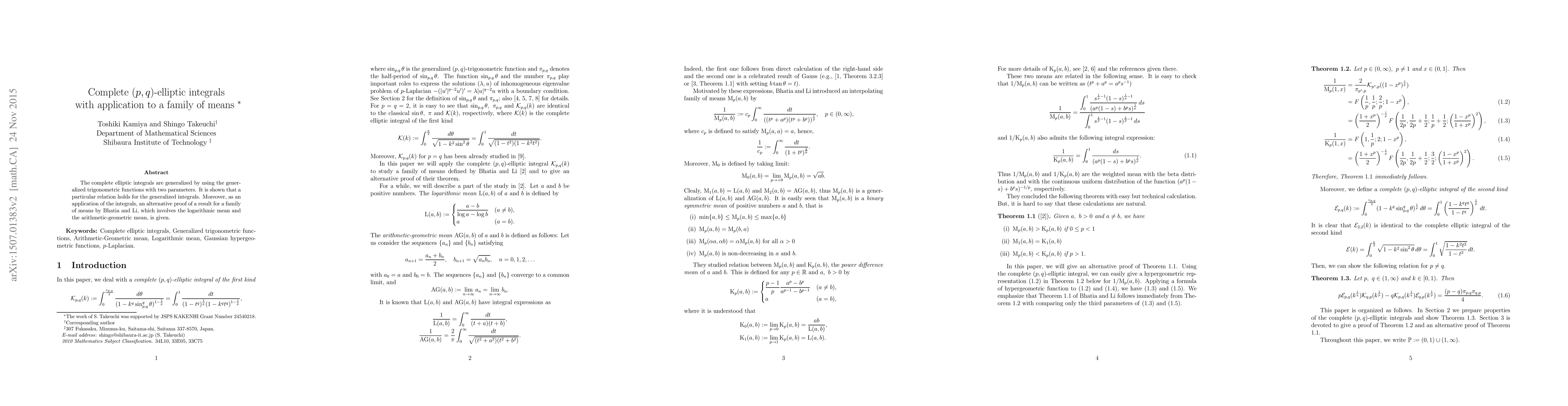 This paper generalizes complete elliptic integrals using generalized trigonometric functions, establishing a specific relation for these integrals. It also provides an alternative proof for a result concerning a family of means involving the logarithmic mean and the arithmetic-geometric mean.