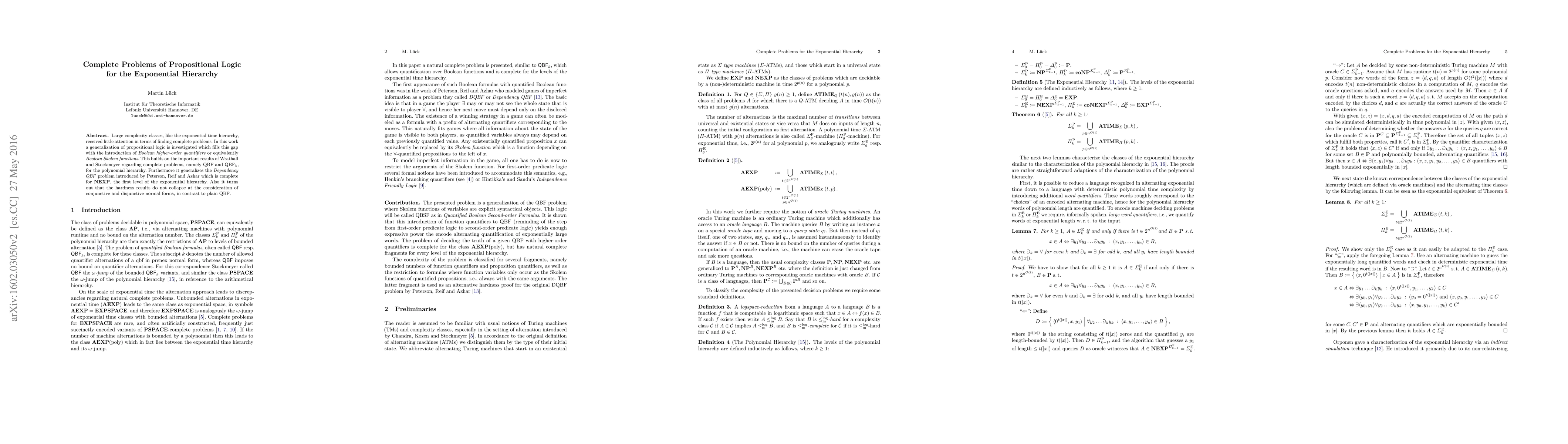 Large complexity classes, like the exponential time hierarchy, received little attention in terms of finding complete problems. In this work a generalization of propositional logic is investigated which fills this gap with the introduction of Boolean higher-order quantifiers or equivalently Boolean Skolem functions. This builds on the important results of Wrathall and Stockmeyer regarding complete problems, namely QBF and QBF-k, for the polynomial hierarchy. Furthermore it generalizes the Dependency QBF problem introduced by Peterson, Reif and Azhar which is complete for NEXP, the first level of the exponential hierarchy. Also it turns out that the hardness results do not collapse at the consideration of conjunctive and disjunctive normal forms, in contrast to plain QBF.