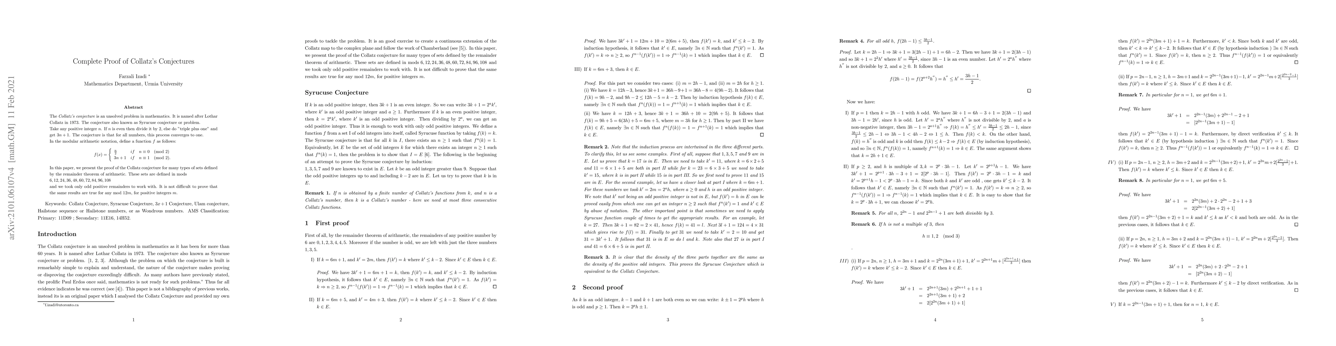 This paper presents a proof of the Collatz conjecture for various sets defined by odd positive remainders in modular arithmetic, specifically for mods 6, 12, 24, etc., up to 108. The authors demonstrate that the conjecture holds for any mod $12m$ for positive integers $m$.