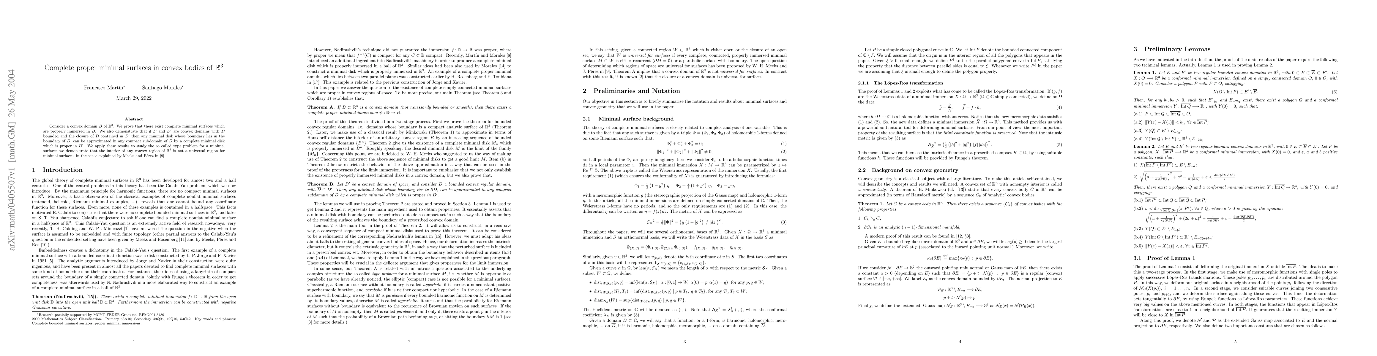 This paper proves the existence of complete minimal surfaces properly immersed in convex domains of $R^3$ and shows that minimal disks in bounded convex domains can be approximated by complete minimal disks in larger convex domains. It concludes by demonstrating that the interior of a convex region cannot serve as a universal region for minimal surfaces.