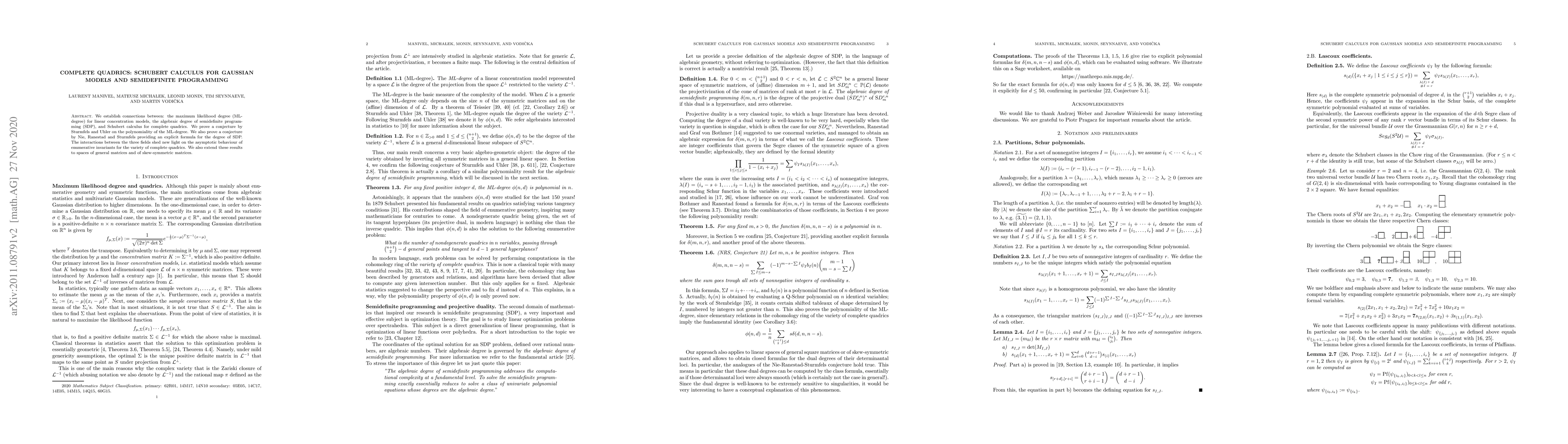 This paper connects the maximum likelihood degree for linear concentration models, the algebraic degree of semidefinite programming, and Schubert calculus for complete quadrics. It proves conjectures regarding the polynomiality of the ML-degree and provides an explicit formula for the degree of SDP, shedding new light on the asymptotic behavior of enumerative invariants.