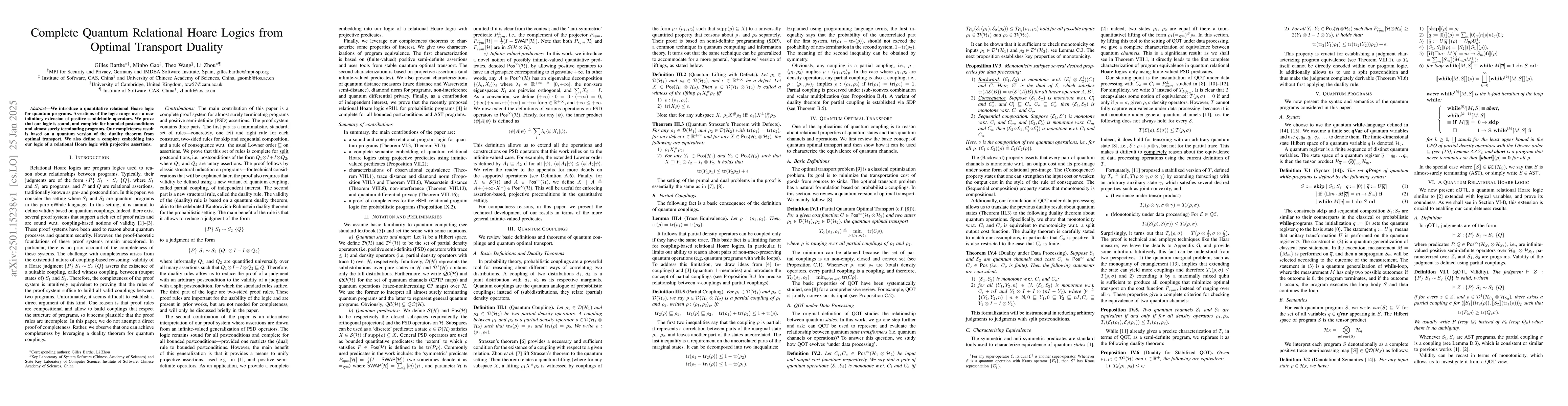 This paper develops a quantitative relational Hoare logic for quantum programs, leveraging a quantum version of optimal transport duality. The logic is proven to be sound and complete for bounded postconditions and terminating programs.