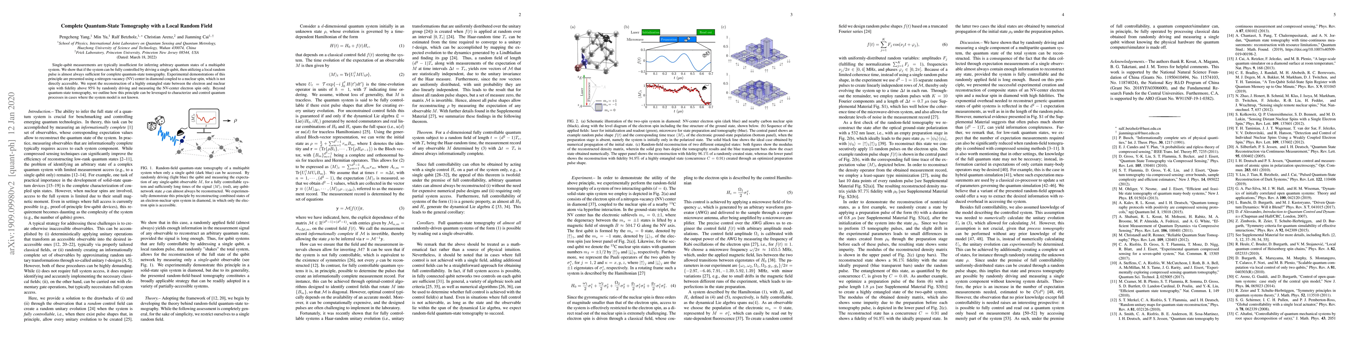 Single-qubit measurements are typically insufficient for inferring arbitrary quantum states of a multi-qubit system. We show that if the system can be fully controlled by driving a single qubit, then utilizing a local random pulse is almost always sufficient for complete quantum-state tomography. Experimental demonstrations of this principle are presented using a nitrogen-vacancy (NV) center in diamond coupled to a nuclear spin, which is not directly accessible. We report the reconstruction of a highly entangled state between the electron and nuclear spin with fidelity above 95%, by randomly driving and measuring the NV-center electron spin only. Beyond quantum-state tomography, we outline how this principle can be leveraged to characterize and control quantum processes in cases where the system model is not known.
