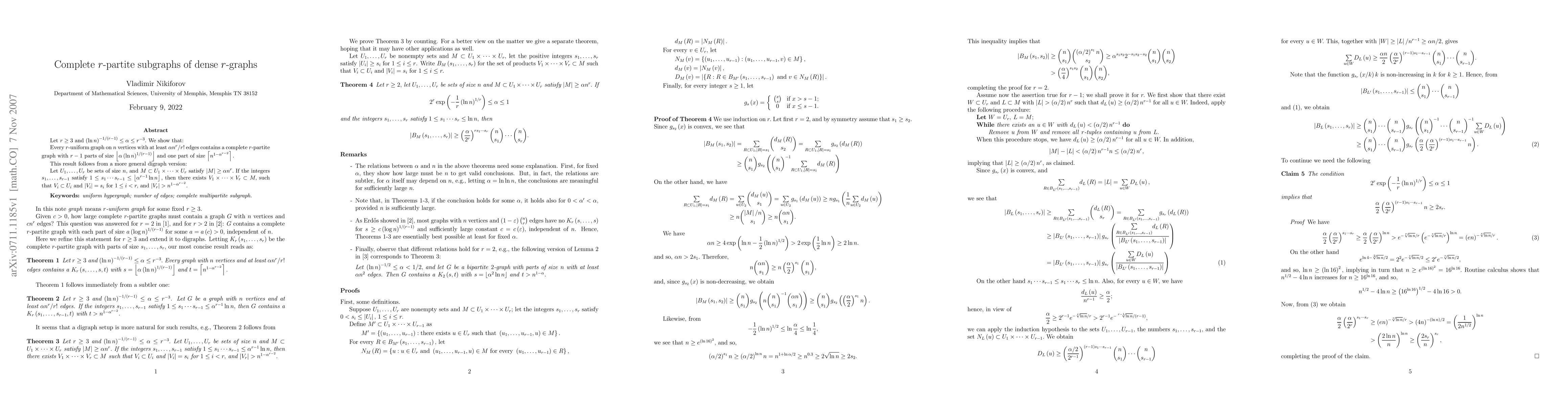 This work extends and strengthens Erdős's 1964 results by providing more detailed conditions on α and set sizes (s1, ..., sr) for the existence of large r-partite subgraphs in dense r-graphs, and by proving analogous results for r ≥ 3.