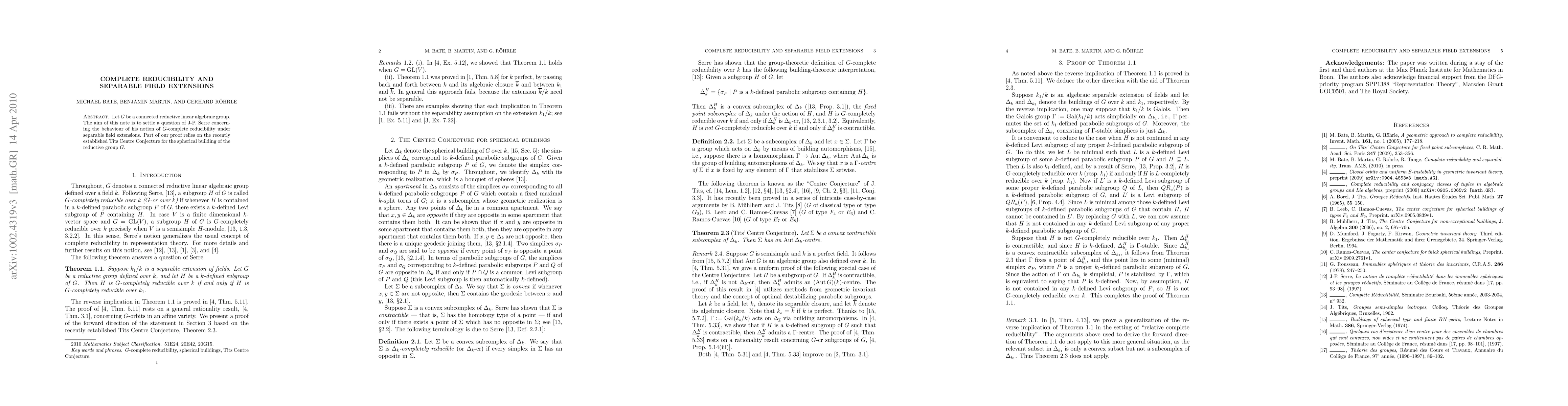 Let G be a connected reductive linear algebraic group. The aim of this note is to settle a question of J-P. Serre concerning the behaviour of his notion of G-complete reducibility under separable field extensions. Part of our proof relies on the recently established Tits Centre Conjecture for the spherical building of the reductive group G.