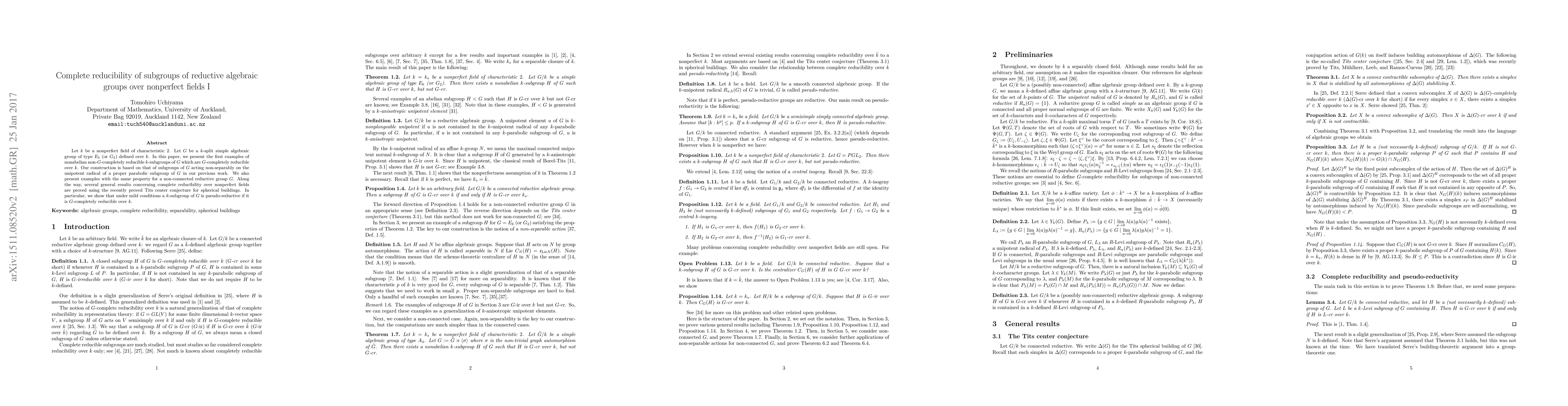 This paper examines the complete reducibility of subgroups within reductive algebraic groups over nonperfect fields, particularly focusing on $k$-split simple algebraic groups of type $E_6$ or $G_2$ in characteristic $2$. It presents examples of nonabelian subgroups that are $G$-completely reducible yet not $G$-completely reducible over $k$, utilizing techniques from previous work on unipotent radicals and employing recent results from the Tits center conjecture for spherical buildings.
