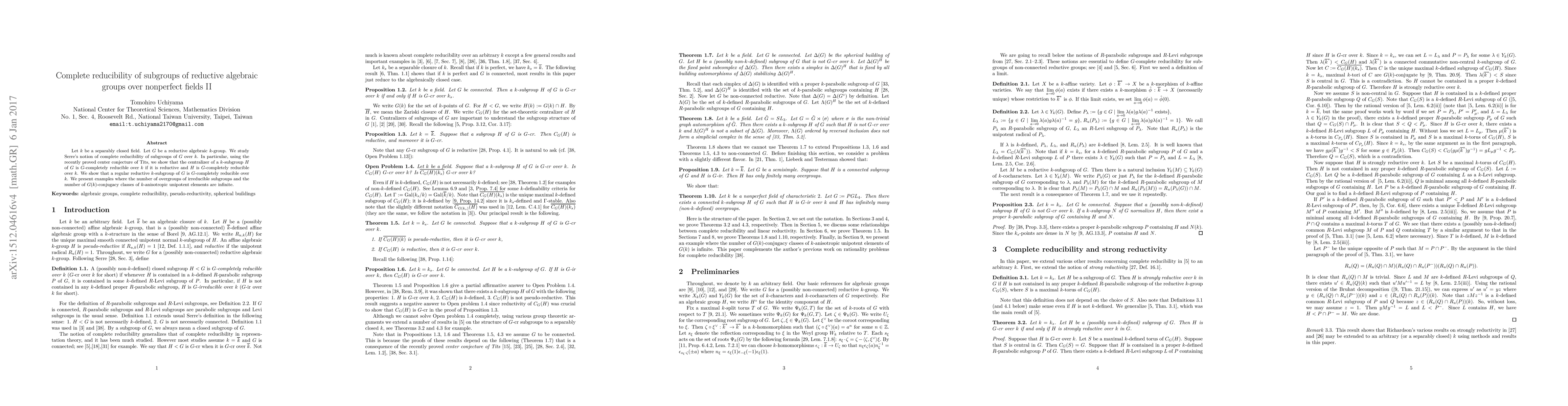 Let k be a separably closed field. Let G be a reductive algebraic k-group. In this paper, we study Serre's notion of complete reducibility of subgroups of G over k. In particular, using the recently proved center conjecture of Tits, we show that the centralizer of a k-subgroup H of G is G-completely reducible over k if it is reductive and H is G-completely reducible over k. We also show that a regular reductive k-subgroup of G is G-completely reducible over k. Various open problems concerning complete reducibility are discussed. We present examples where the number of overgroups of irreducible subgroups and the number of G(k)-conjugacy classes of k-anisotropic unipotent elements are infinite.