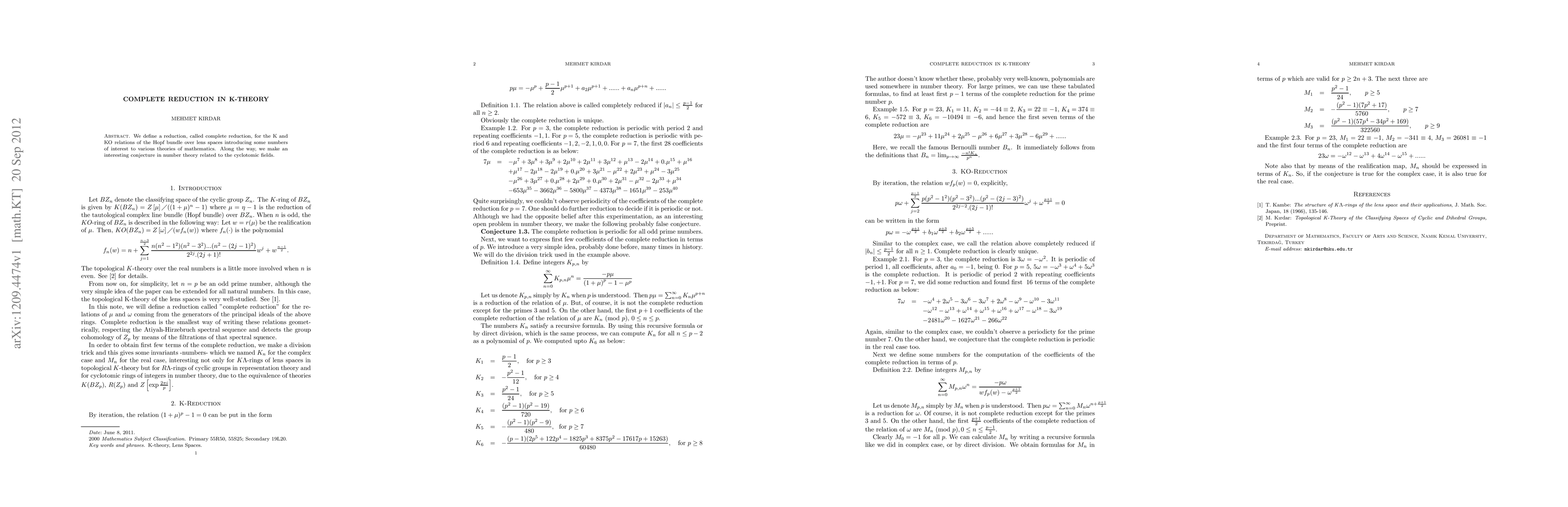 We define a reduction, called complete reduction, for the K and KO relations of the Hopf bundle over lens spaces introducing some numbers of interest to various theories of mathematics. Along the way, we make an interesting conjecture in number theory related to the cyclotomic fields.