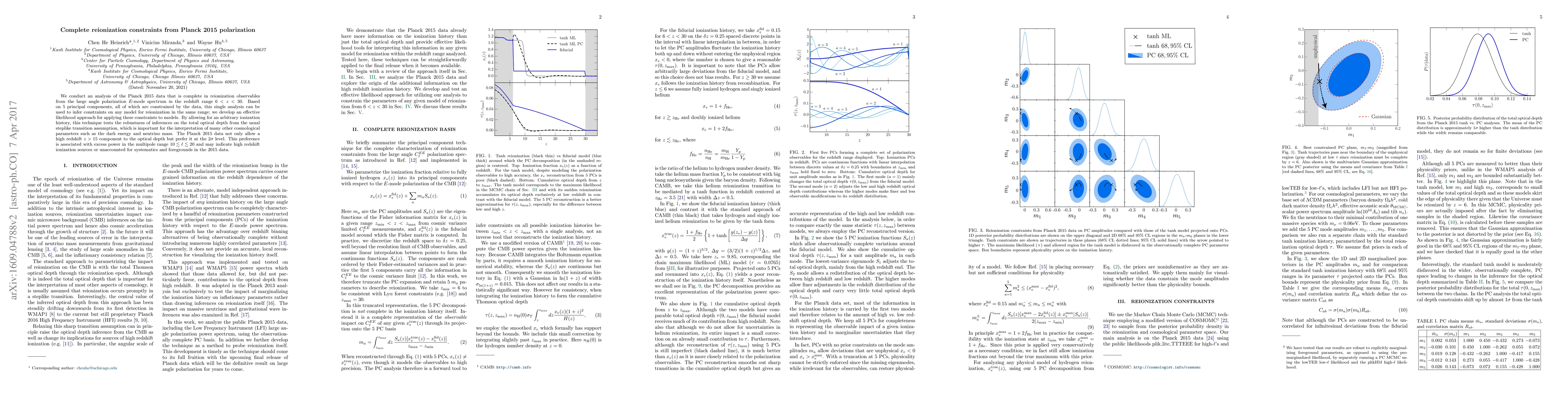 We conduct an analysis of the Planck 2015 data that is complete in reionization observables from the large angle polarization $E$-mode spectrum in the redshift range $6 < z < 30$. Based on 5 principal components, all of which are constrained by the data, this single analysis can be used to infer constraints on any model for reionization in the same range; we develop an effective likelihood approach for applying these constraints to models. By allowing for an arbitrary ionization history, this technique tests the robustness of inferences on the total optical depth from the usual step-like transition assumption, which is important for the interpretation of many other cosmological parameters such as the dark energy and neutrino mass. The Planck 2015 data not only allow a high redshift $z>15$ component to the optical depth but prefer it at the $2\sigma$ level. This preference is associated with excess power in the multipole range $10 \lesssim \ell \lesssim 20$ and may indicate high redshift ionization sources or unaccounted for systematics and foregrounds in the 2015 data.