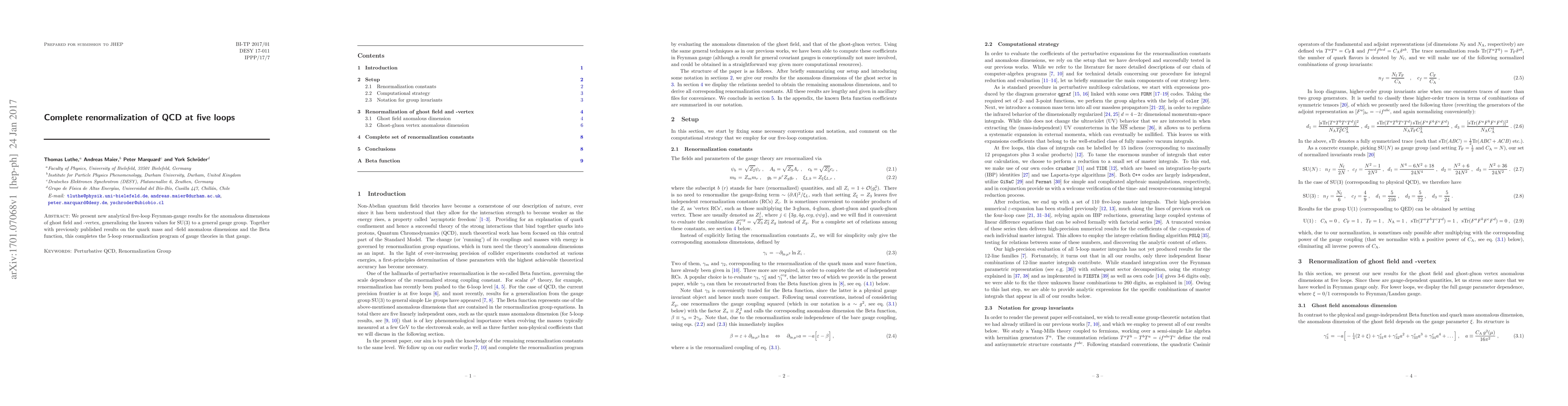 Researchers have completed a 5-loop renormalization program for gauge theories, providing new values for anomalous dimensions of ghost field, vertex, quark mass, and Beta function in the Feynman gauge.