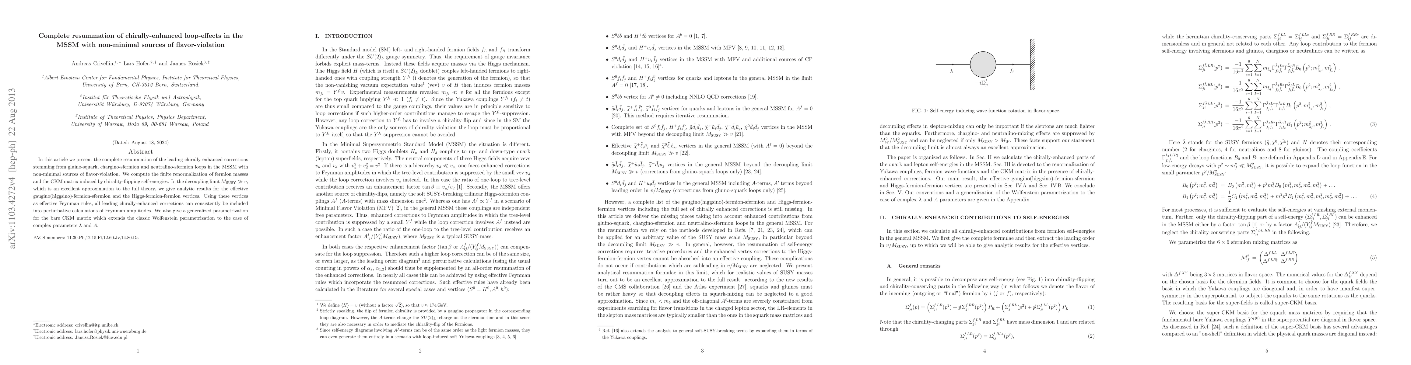 This paper provides a complete resummation of leading chirally-enhanced corrections from gluino-squark, chargino-sfermion, and neutralino-sfermion loops in the MSSM with non-minimal flavor-violation. It computes finite renormalization effects on fermion masses and the CKM matrix, offering analytic results for effective vertices in the decoupling limit.