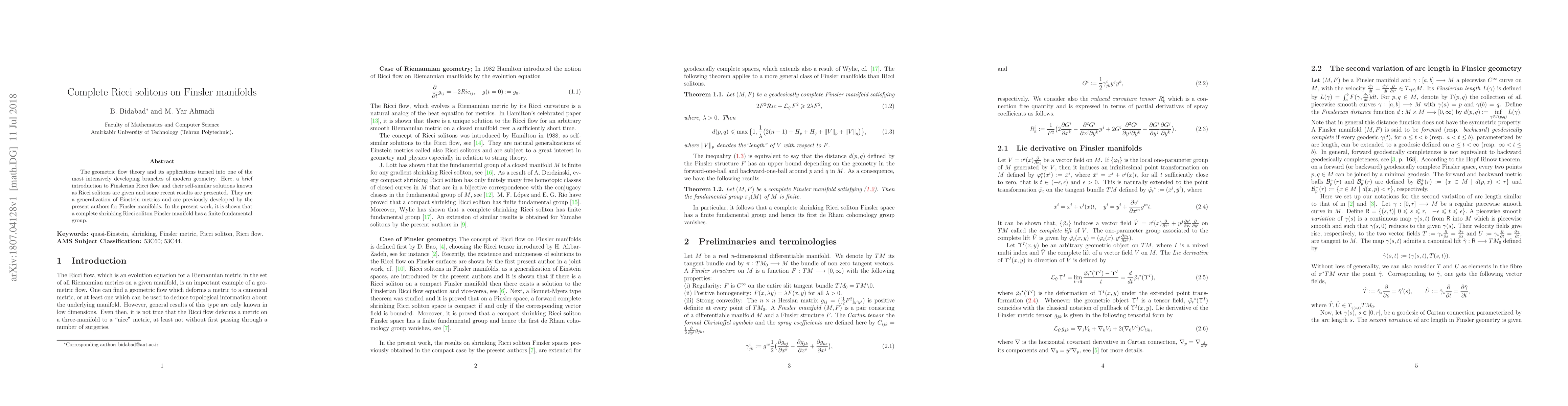 Title: Complete Ricci solitons on Finsler manifolds Summary: This paper discusses the Ricci flow theory in the context of Finsler geometry, focusing on Ricci solitons—self-similar solutions—and presents new results. It concludes that a complete shrinking Ricci soliton on a Finsler manifold has a finite fundamental group.