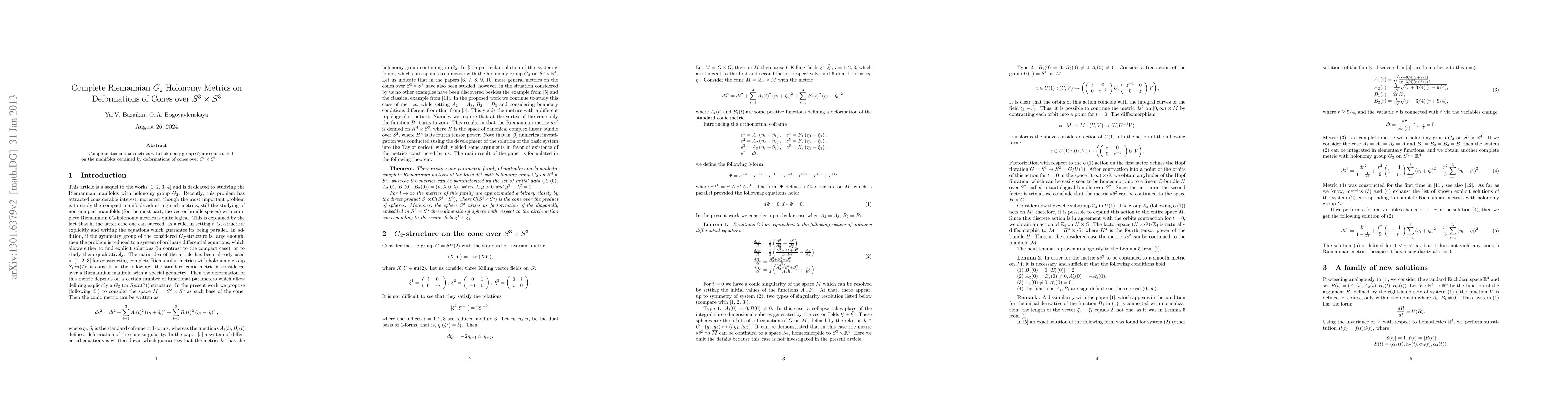 Title: Complete Riemannian $G_2$ Holonomy Metrics on Deformations of Cones over $S^3\times S^3$ Summary: The paper constructs complete Riemannian metrics with $G_2$ holonomy on manifolds derived from deformed cones over $S^3 \times S^3$. This provides new examples of $G_2$ holonomy manifolds.