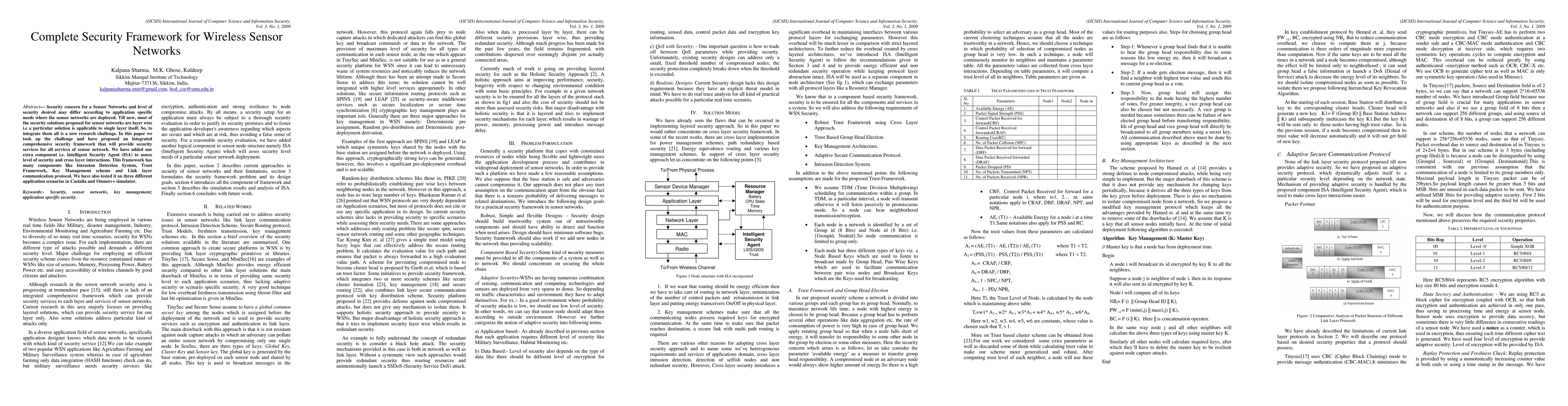 This paper proposes a comprehensive security framework for wireless sensor networks, integrating multiple security solutions across different layers. The framework includes an Intelligent Security Agent, Intrusion Detection System, Trust Framework, Key Management, and a Link layer protocol, tested on three scenarios in Castalia and Omnet++ simulators.