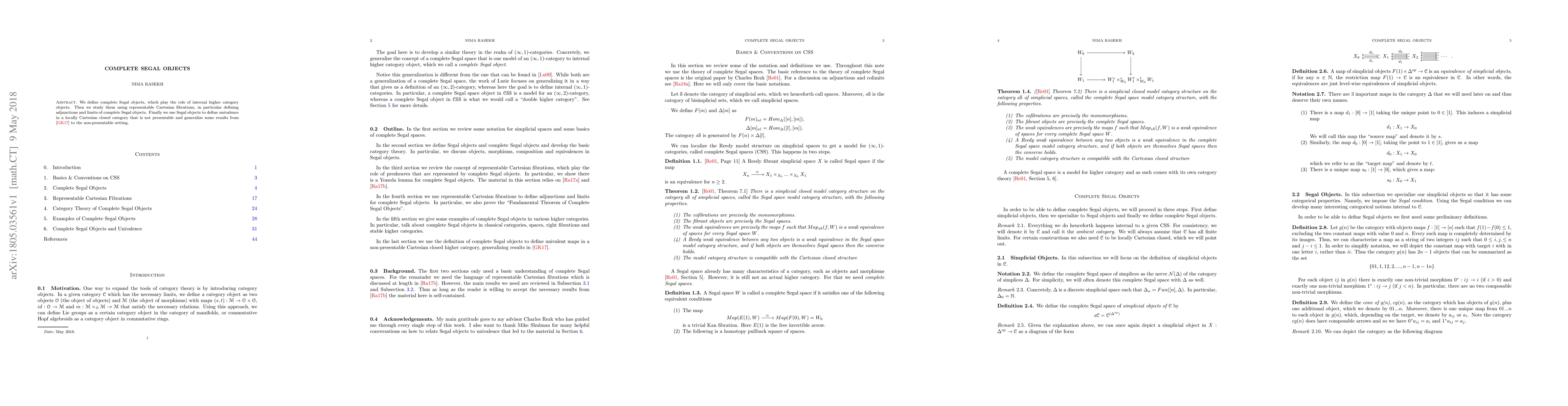 Summary: This paper introduces complete Segal objects as internal higher category constructs and explores their properties via representable Cartesian fibrations, defining adjunctions and limits. It also extends univalence to non-presentable locally Cartesian closed categories, broadening previous results.