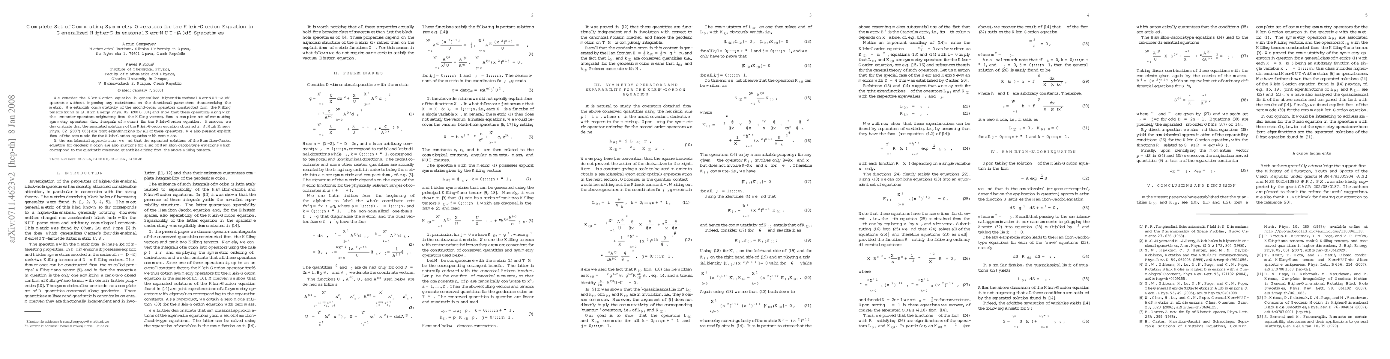 We consider the Klein-Gordon equation in generalized higher-dimensional Kerr-NUT-(A)dS spacetime without imposing any restrictions on the functional parameters characterizing the metric. We establish commutativity of the second-order operators constructed from the Killing tensors found in arXiv:hep-th/0612029 and show that these operators, along with the first-order operators originating from the Killing vectors, form a complete set of commuting symmetry operators (i.e., integrals of motion) for the Klein-Gordon equation. Moreover, we demonstrate that the separated solutions of the Klein-Gordon equation obtained in arXiv:hep-th/0611245 are joint eigenfunctions for all of these operators. We also present explicit form of the zero mode for the Klein-Gordon equation with zero mass. In the semiclassical approximation we find that the separated solutions of the Hamilton-Jacobi equation for geodesic motion are also solutions for a set of Hamilton-Jacobi-type equations which correspond to the quadratic conserved quantities arising from the above Killing tensors.
