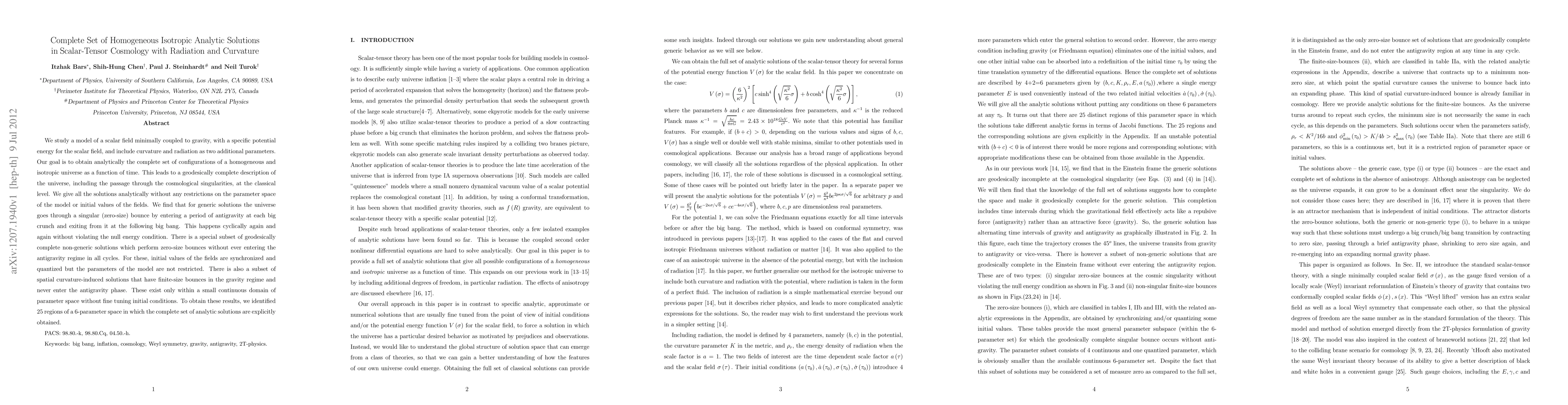 We study a model of a scalar field minimally coupled to gravity, with a specific potential energy for the scalar field, and include curvature and radiation as two additional parameters. Our goal is to obtain analytically the complete set of configurations of a homogeneous and isotropic universe as a function of time. This leads to a geodesically complete description of the universe, including the passage through the cosmological singularities, at the classical level. We give all the solutions analytically without any restrictions on the parameter space of the model or initial values of the fields. We find that for generic solutions the universe goes through a singular (zero-size) bounce by entering a period of antigravity at each big crunch and exiting from it at the following big bang. This happens cyclically again and again without violating the null energy condition. There is a special subset of geodesically complete non-generic solutions which perform zero-size bounces without ever entering the antigravity regime in all cycles. For these, initial values of the fields are synchronized and quantized but the parameters of the model are not restricted. There is also a subset of spatial curvature-induced solutions that have finite-size bounces in the gravity regime and never enter the antigravity phase. These exist only within a small continuous domain of parameter space without fine tuning initial conditions. To obtain these results, we identified 25 regions of a 6-parameter space in which the complete set of analytic solutions are explicitly obtained.