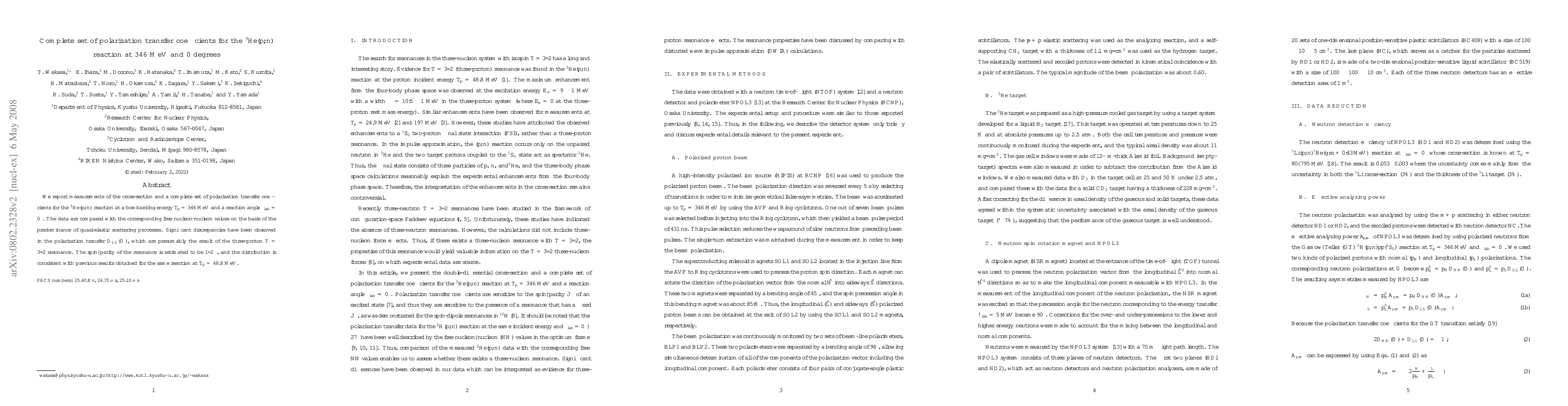 This paper reports measurements of the cross-section and polarization transfer coefficients for the ${}^{3}{\rm He}(p,n)$ reaction at 346 MeV and 0 degrees, revealing significant discrepancies in $D_{LL}(0^{\circ})$, likely due to a three-proton resonance with spin-parity $1/2^-$. These findings contrast with free nucleon-nucleon values, suggesting unique nuclear dynamics at higher energies.