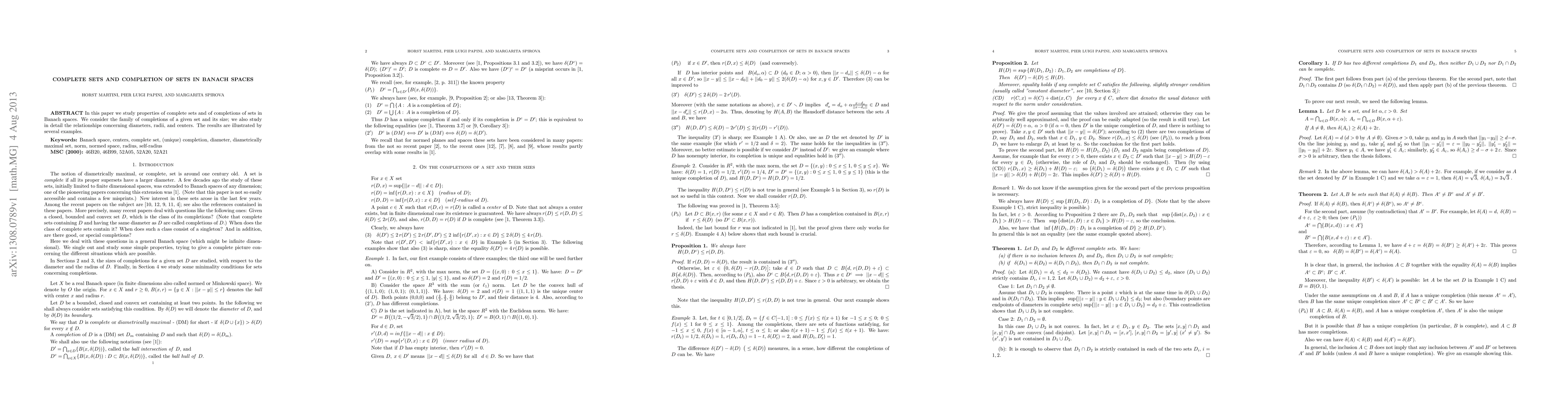 This paper studies properties of complete sets and completions of sets in Banach spaces, exploring relationships between diameters, radii, and centers, with several examples illustrating the findings.