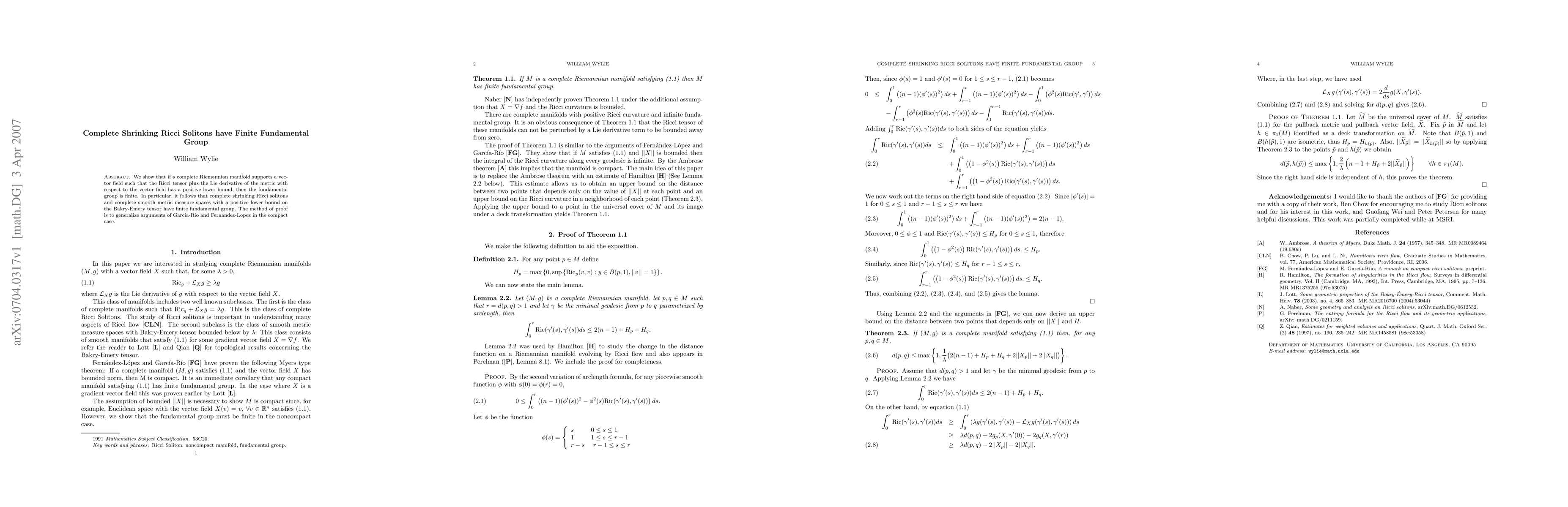 We show that if a complete Riemannian manifold supports a vector field such that the Ricci tensor plus the Lie derivative of the metric with respect to the vector field has a positive lower bound, then the fundamental group is finite. In particular, it follows that complete shrinking Ricci solitons and complete smooth metric measure spaces with a positive lower bound on the Bakry-Emery tensor have finite fundamental group. The method of proof is to generalize arguments of Garcia-Rio and Fernandez-Lopez in the compact case.