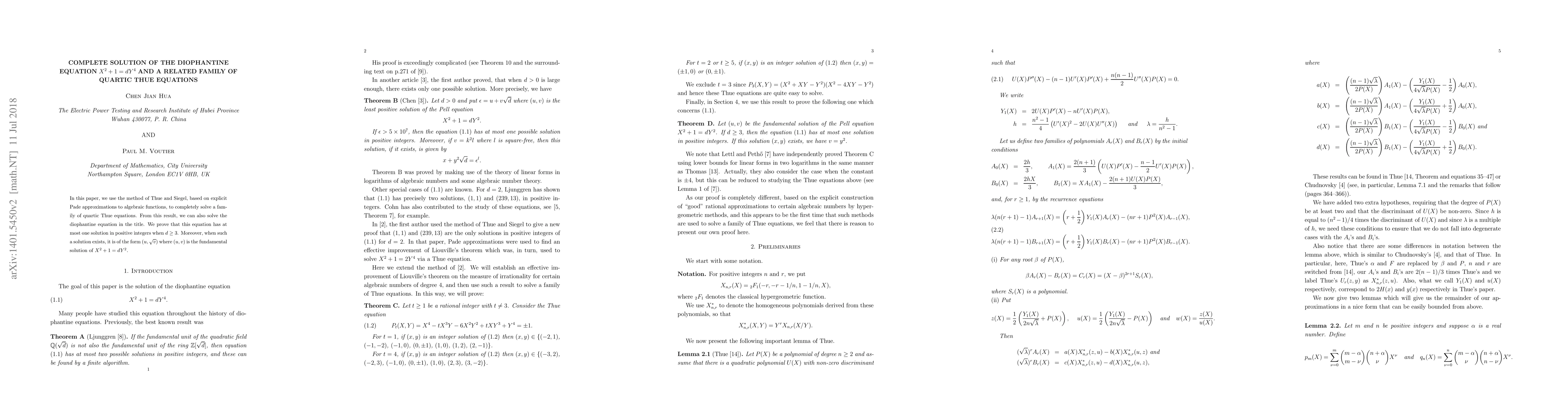 In this paper, we use the method of Thue and Siegel, based on explicit Pade approximations to algebraic functions, to completely solve a family of quartic Thue equations. From this result, we can also solve the diophantine equation in the title. We prove that this equation has at most one solution in positive integers when $d \geq 3$. Moreover, when such a solution exists, it is of the form $(u,\sqrt{v})$ where $(u,v)$ is the fundamental solution of $X^{2}+1=dY^{2}$.
